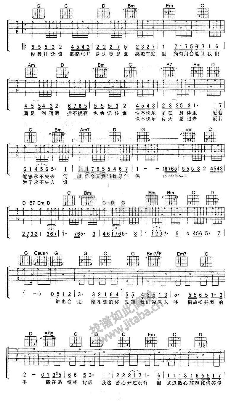 人来人往吉他谱用G调编谱,由吉他吧改编。有太多太多的人喜欢陈奕迅了,他总能带给我们惊喜,那些年听过的陈奕迅的歌还少吗?这首歌,有悲伤的旋律,故事性完整的歌词。林夕用简单的叙述便将一段恋爱的过程表达了出来,这样丰富的歌曲,听起来很满足,这个优秀的作品,有人将其誉为粤语歌词的巅峰。那些默默从事音乐制作的人,用他们的才华为人们创造出了一次又一次的惊喜与感动。致敬。