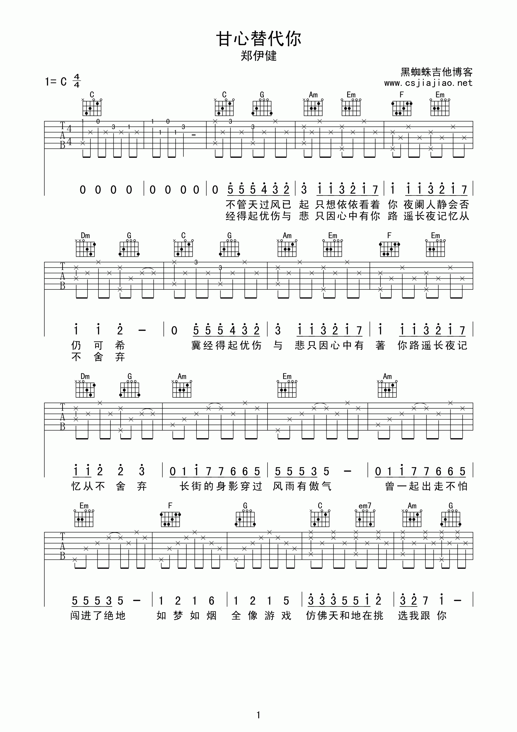 以上就是4/4节拍 C调版的甘心替代弹唱简谱,如果正是您所寻找的六线高清图片谱,希望能收藏本站,这里会完全免费且源源不断更新各种郑伊健简单入门曲谱
