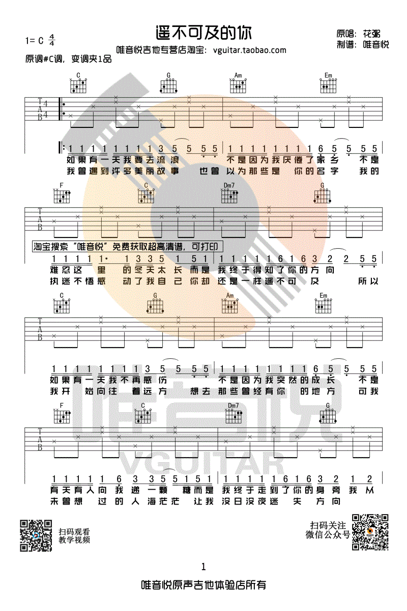 遥不可及的你吉他谱,它是花粥演唱的歌曲,由唯音悦制谱,是一首经典歌曲编配的C调吉他谱,演唱时可夹1品,原调#C本谱采用C调花粥创非常好听的弹唱曲谱,下面完整版高清曲谱由吉他谱大全为大家更新分享,有喜欢吉它的朋友欢迎关注!