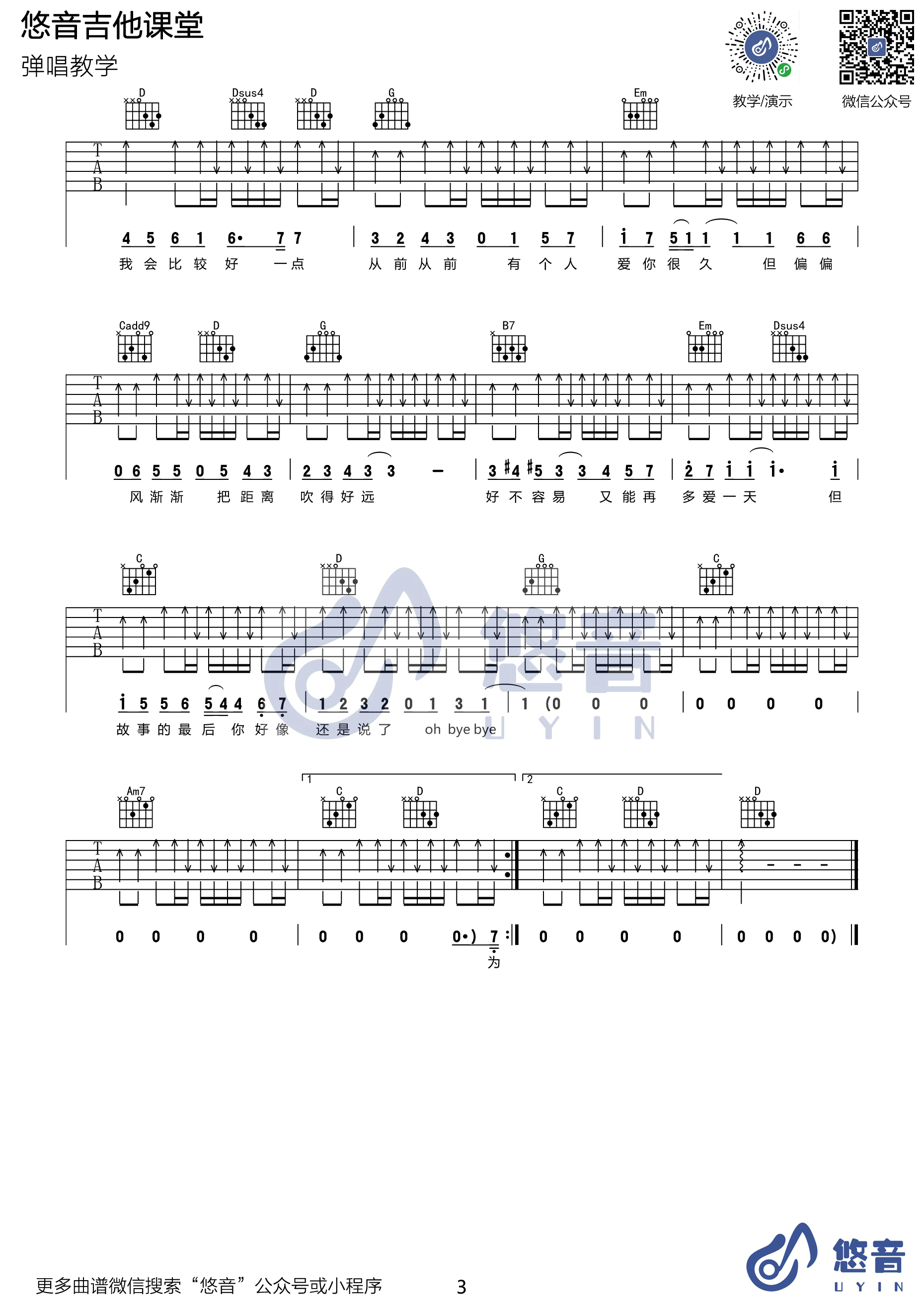 晴天吉他谱本曲谱是选用了G调指法,由悠音课堂编配完成。《晴天》这首歌的旋律总是耳熟能详,哼着他的小调总是那么的美好,似乎多了几分对未来的向往,对爱情的期待,我感受到的是快乐幸福,第一次听这首歌时阳光是那么的灿烂,真希望时光倒退,我想我会更加勇敢些,就像歌词里说“从前从前有个人爱你很久”。但最终还是分开,献给那个为爱懦弱的自己也希望以后每个人在面对爱情时,可以勇敢去爱。如果,我多为你撑一次伞,你会不会牵起我的手?