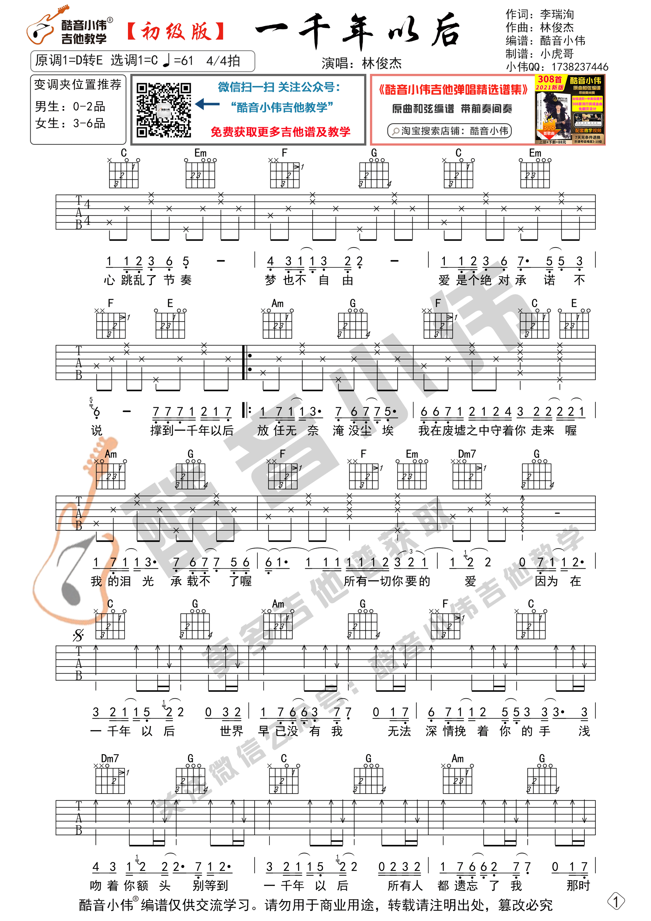 一千年以后吉他谱,原版林俊杰歌曲,简单初级版弹唱教学,酷音小伟版六线指弹简谱图