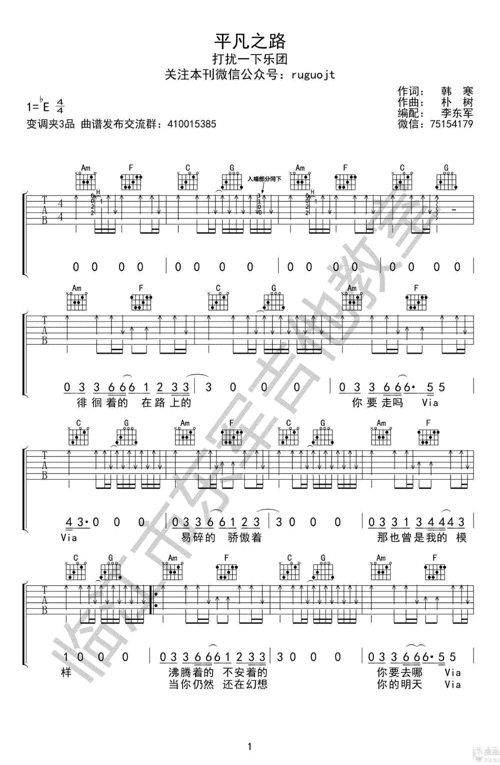 《平凡之路》这首歌,打扰一下乐团翻唱版,平凡之路吉他六线谱,弹唱现场版,bE调,变调夹夹3品,李东军的编配,。
