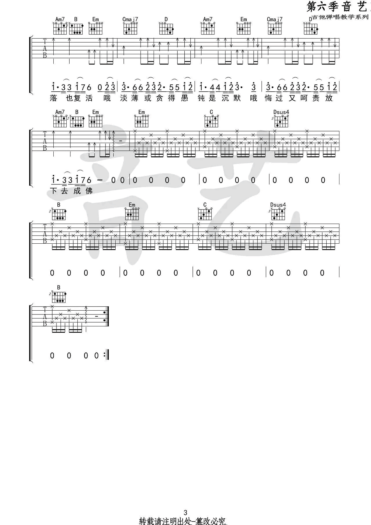 不露声色吉他谱本曲谱是选用了C调指法,由音艺吉他编配完成。这首歌曲呢作词作曲演唱都是由jam,完成的,我不太熟悉这个歌手,但是看到这首歌曲是这位创作者自己完成的,感觉就非常不错,这首歌也非常不错,伴奏非常的清晰,这首歌曲前部分呢都是比较音调比较低,有一种沉闷的感觉,到后面高潮部分就是音调比较高,普通的唱腔可能没法唱出这样的音调,可见歌手的唱功非常不错。