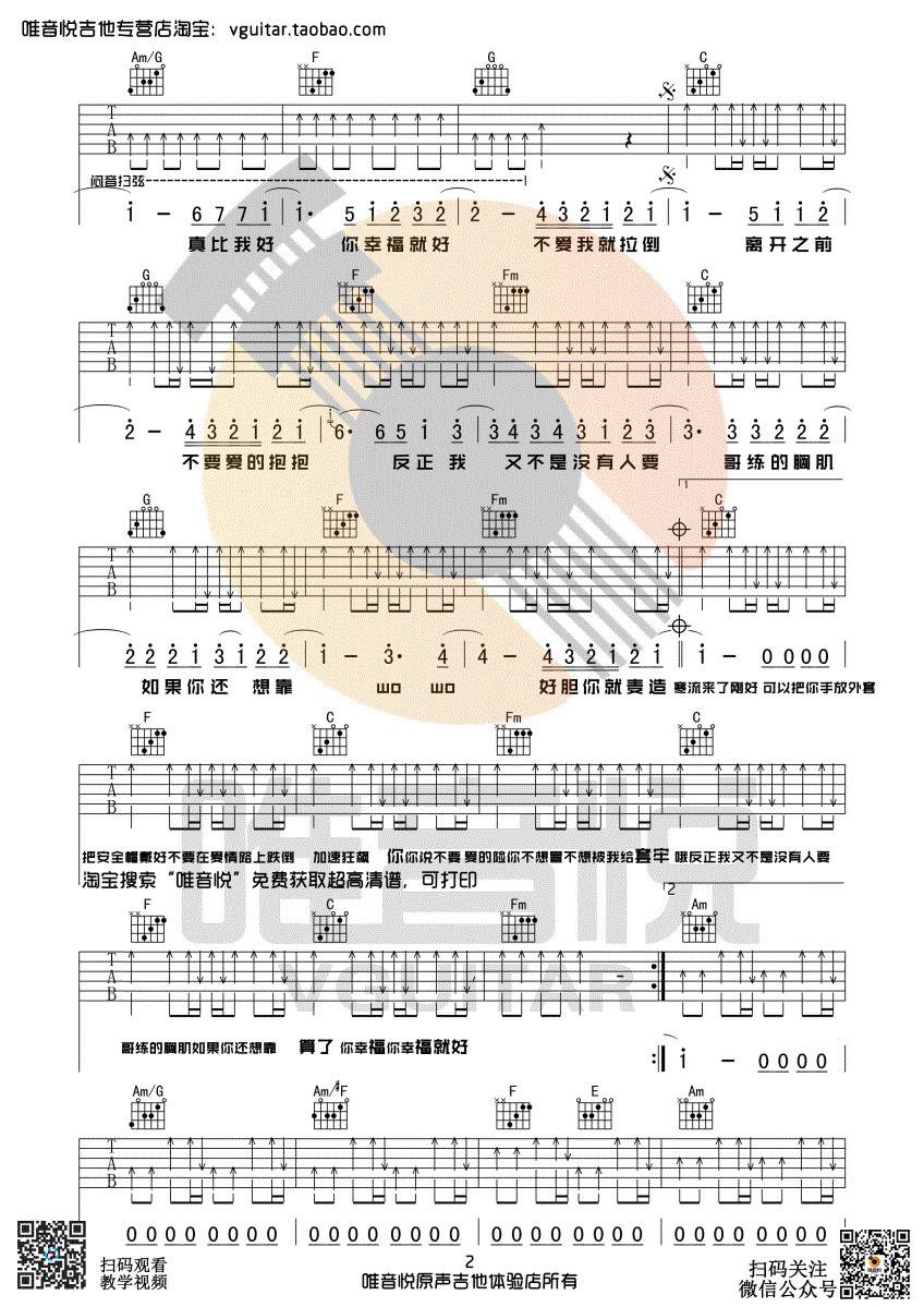 不爱我就拉倒吉他谱本曲谱是选用了C调指法,由唯音悦编配完成。这首歌曲是由周杰伦演唱的,听这歌名就给人一种,无法得到爱,但是我也要酷的感觉,不爱就拉倒,其实改成不爱就滚蛋也问题不大吧,整首歌曲的曲风还是很有周杰伦的味道的,是他的大多数音乐作品相似的曲风,周杰伦的歌迷也是挺喜爱这首的,近几年还巍这首歌重新拍了mv,画质非常高清,为这首歌曲加分了许多。