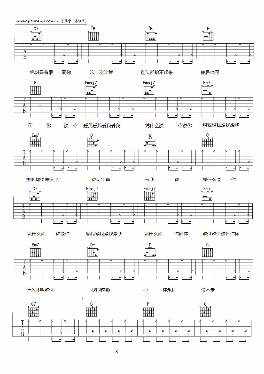 凭什么说吉他谱,它是刘心演唱的歌曲,由恋琴编配制谱,是一首经典歌曲编配的C调指弹编配的曲谱,