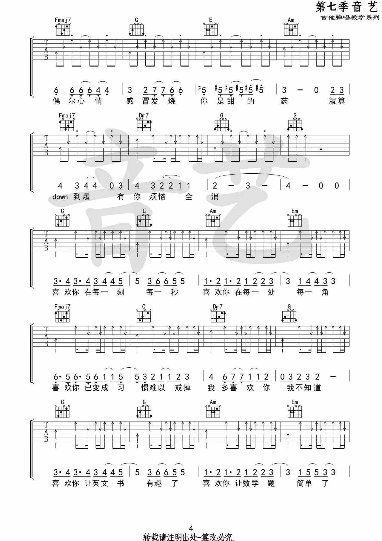 歌曲选自《我多喜欢你,你会知道》专辑非常好听的弹唱曲谱,下面4张 5张高清曲谱由吉它简谱网为大家更新分享,有喜欢吉它的朋友欢迎关注!