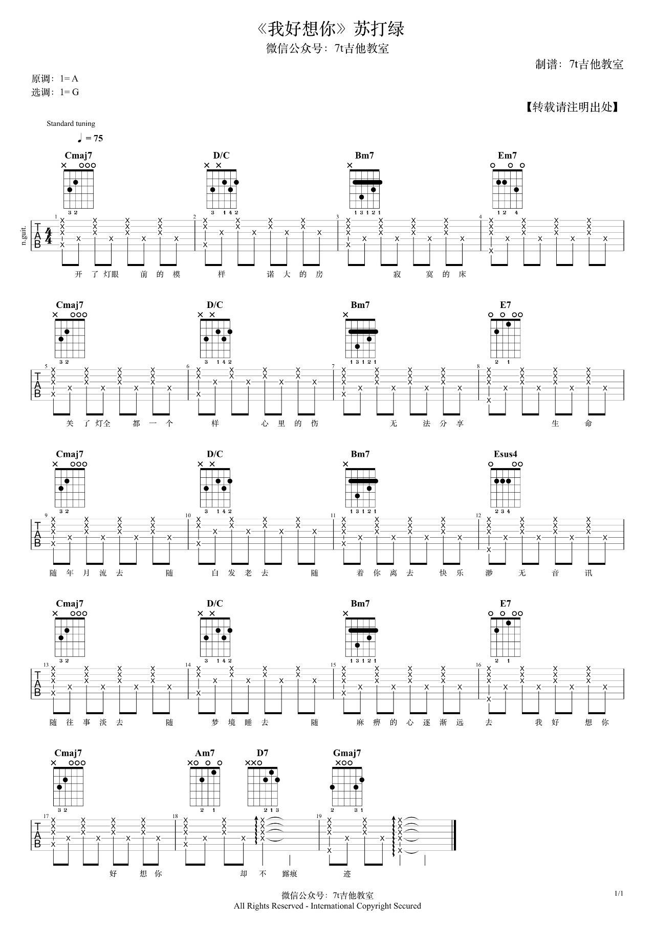 我好想你吉他谱,它是苏打绿演唱的歌曲,由7T吉他教室编配制谱,是一首经典歌曲编配的G调指弹编配的曲谱,