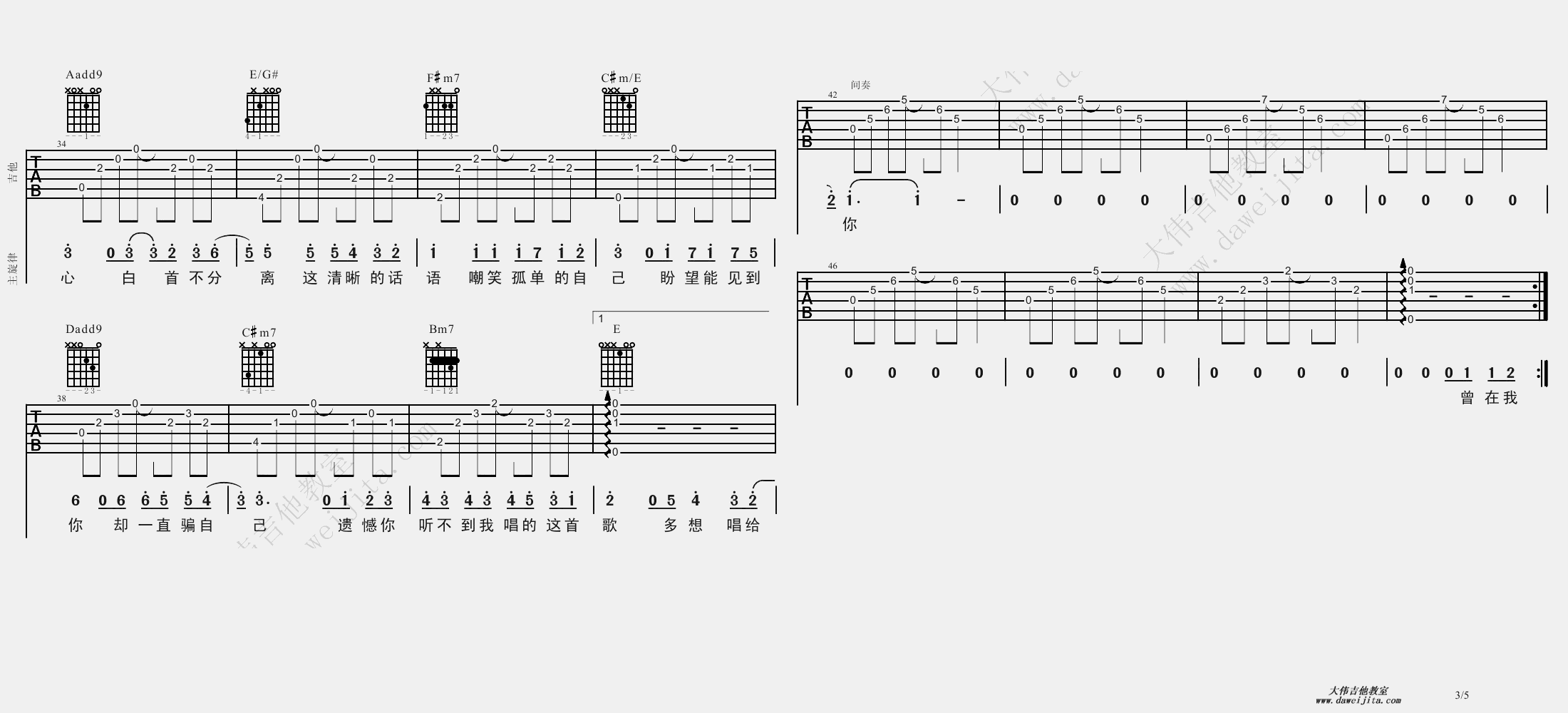 愿得一人心吉他谱,它是李行亮演唱的歌曲,由大伟吉他教室编配制谱,是一首经典歌曲编配的A调指弹编配的曲谱,