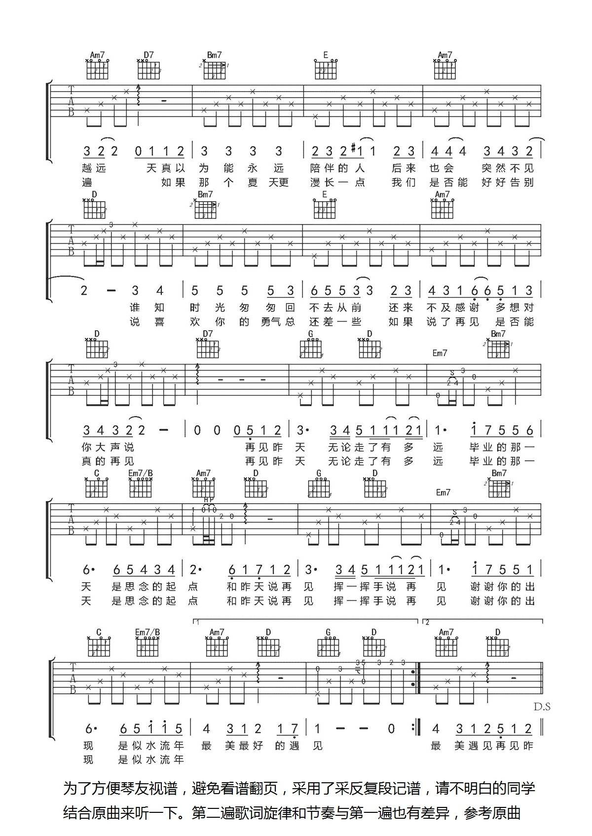 再见昨天吉他谱本曲谱是选用了B调指法,由齐歌吉他编配。再见昨天,来不及挥挥手说再见,就再也没有机会见到你了,我的故事可能太过平凡幼稚,经不起你们的推敲,但是那也是我人生中最精彩的故事了。别人说毕业季就是分手季,我的毕业却不是分手,哪有分手这么严重,根本就是只有我喜欢他,他什么都不知道,很后悔没有告诉过他实话,我喜欢他,毕业之后却再也见不到他了,青春就这样结束了。
