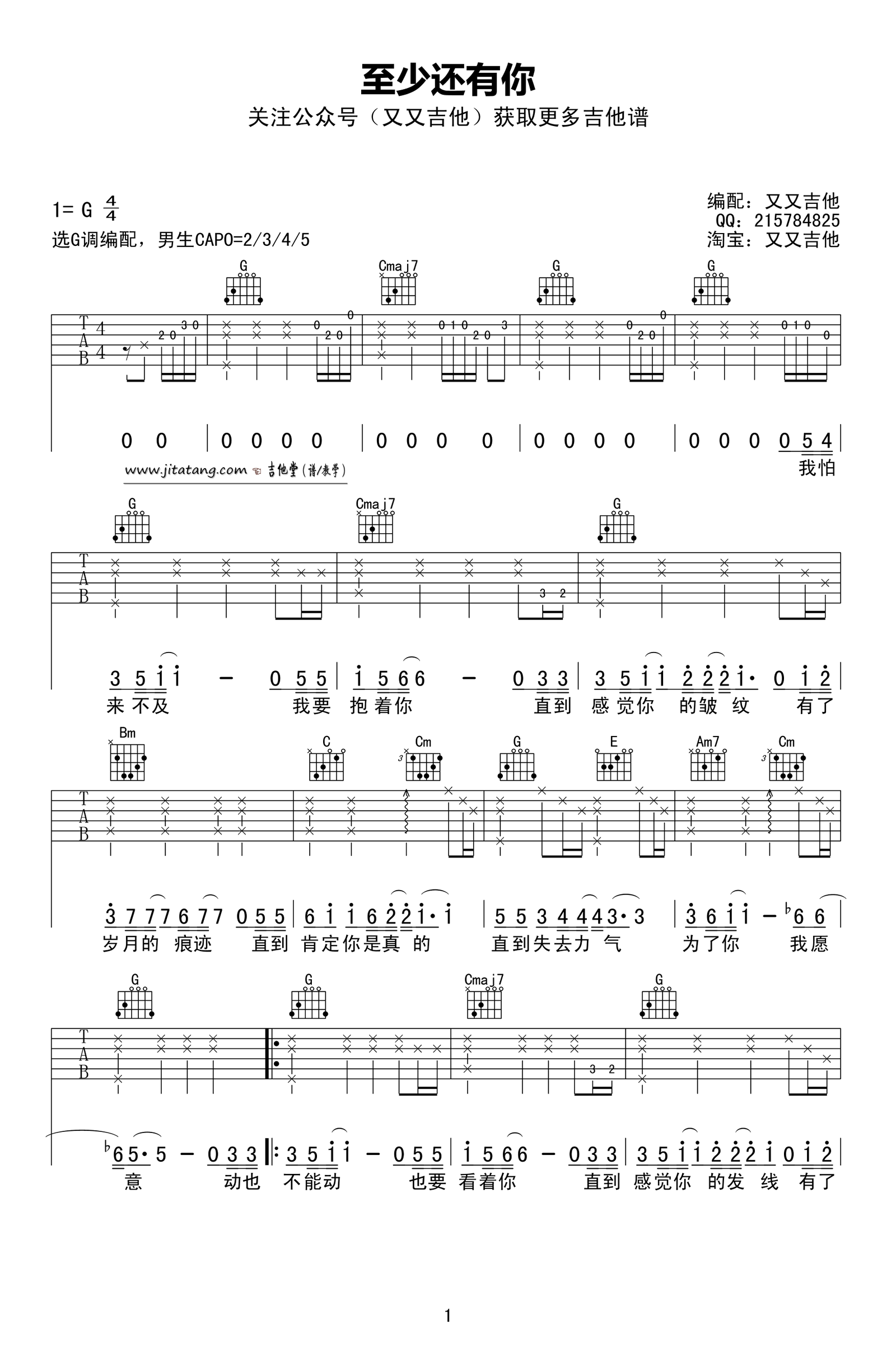 至少还有你吉他谱,它是林忆莲演唱的歌曲,由又又吉他编配制谱,是一首经典歌曲编配的G调指弹编配的曲谱,