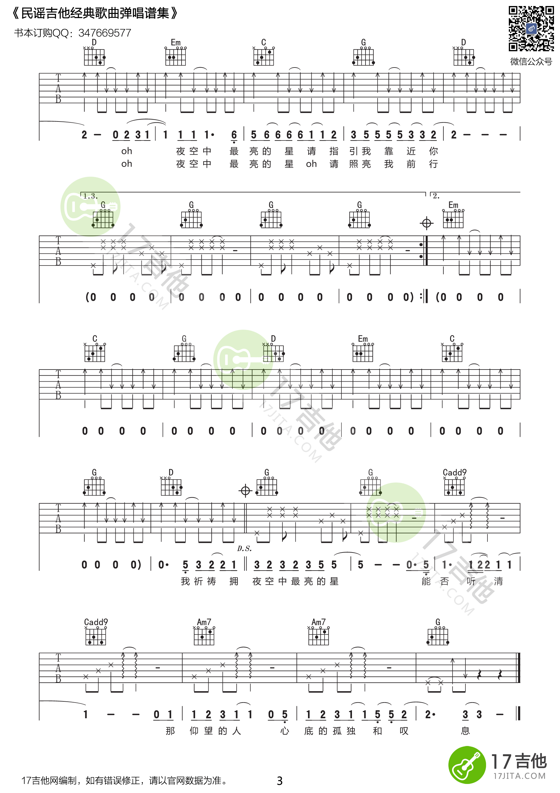夜空中最亮的星吉他谱,悠音课堂版本。那天晚上,梦见自己骑着自行车,一头黑色的长发,你在远方不远的黄色路灯下,你在等最新的通过信息,我把自行车停在离你最近的一棵树下,好像你低头我就知道了,梦想总是喜欢开玩笑捉迷藏,我说呀,你听我的耳机里有什么,你说是夜空中最亮的星,你喜欢吗,我把夜空中最亮的星送给你呀,不要气馁好不好,我会一直等你。