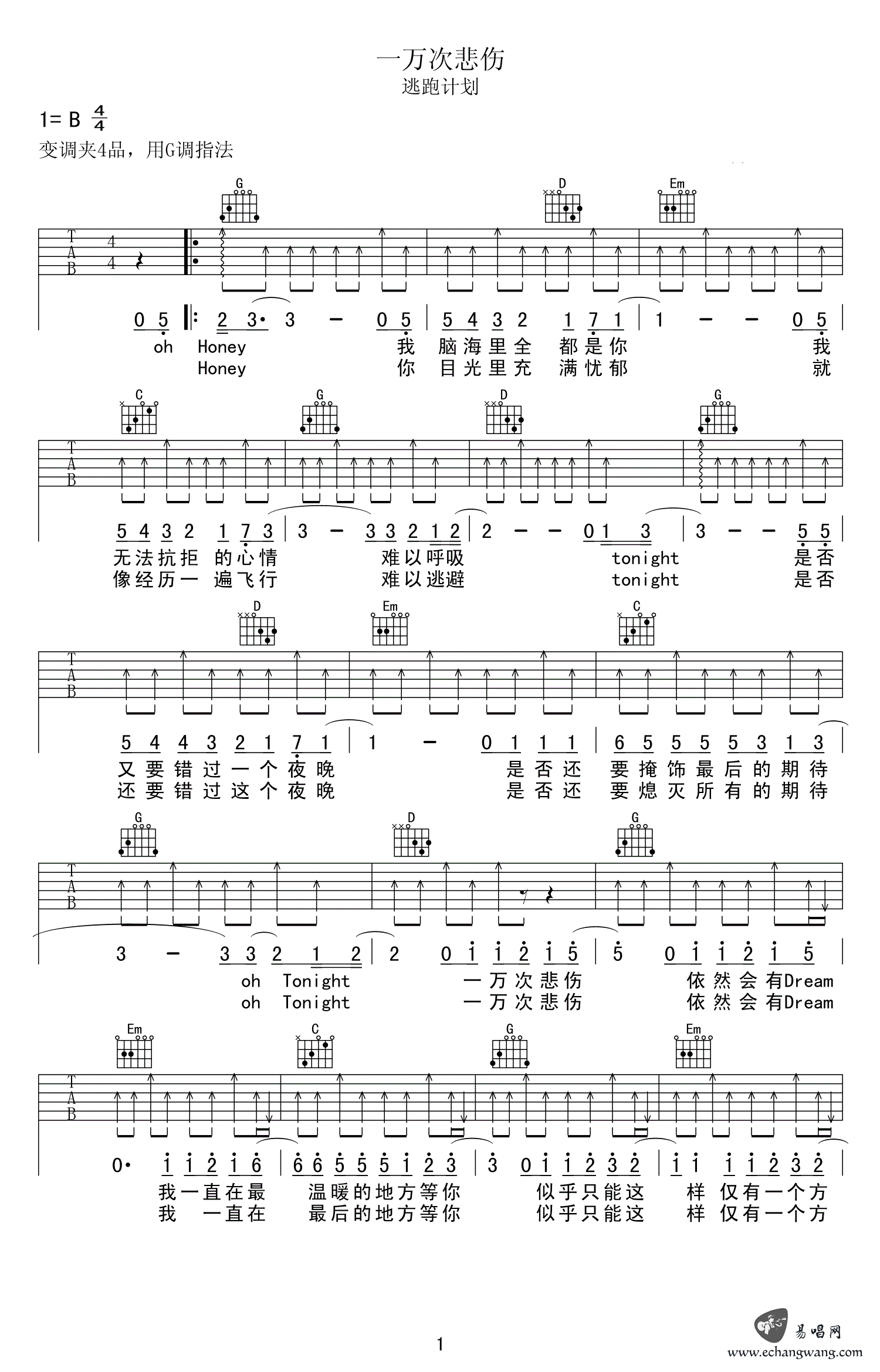 一万次悲伤吉他谱它是毛川演唱的歌曲人声和谐优美,和谐和谐。由网络制谱是一首经典歌曲编配的G调吉他谱,演唱时可夹四品,原调B调本谱采用原调非常好听的弹唱曲谱,下面完整版高清曲谱由吉他谱大全为大家更新分享,有喜欢吉它的朋友欢迎关注! 一万次悲伤这首歌,原调B调,变调夹夹四品,用G调指法。一万次悲伤六线谱,扫弦版弹唱谱,图片高清简谱。首歌曲似乎有一种力量,就是明明是一首描述孤独、绝望的歌曲,却被逃跑计划唱出了希望与温暖。