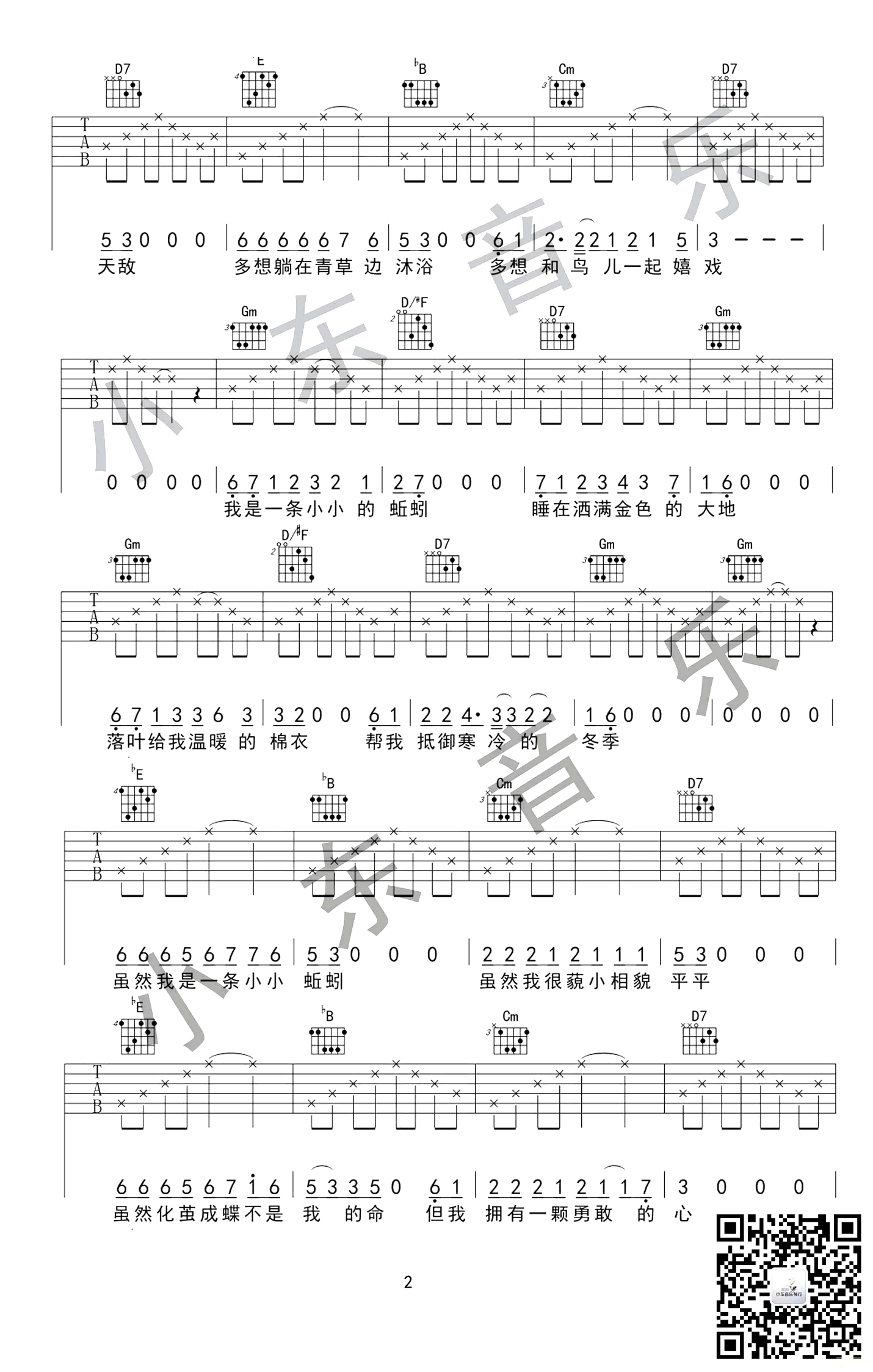 蚯蚓吉他谱它是陈曦董冬冬演唱的歌曲吉他的音乐表现力很好,听起来非常有感染力。由小东音乐制谱是一首经典歌曲编配的吉他谱,,本谱采用六线谱非常好听的弹唱曲谱,下面完整版高清曲谱由吉他谱大全为大家更新分享,有喜欢吉它的朋友欢迎关注! 杨紫《蚯蚓》这首歌,六线谱高清版,四张图片谱两页显示。电视剧《欢乐颂2》插曲。蚯蚓吉他弹唱谱,原版和声编配。小东音乐分享,整理。无论生活再艰辛,我都要有勇敢的心。