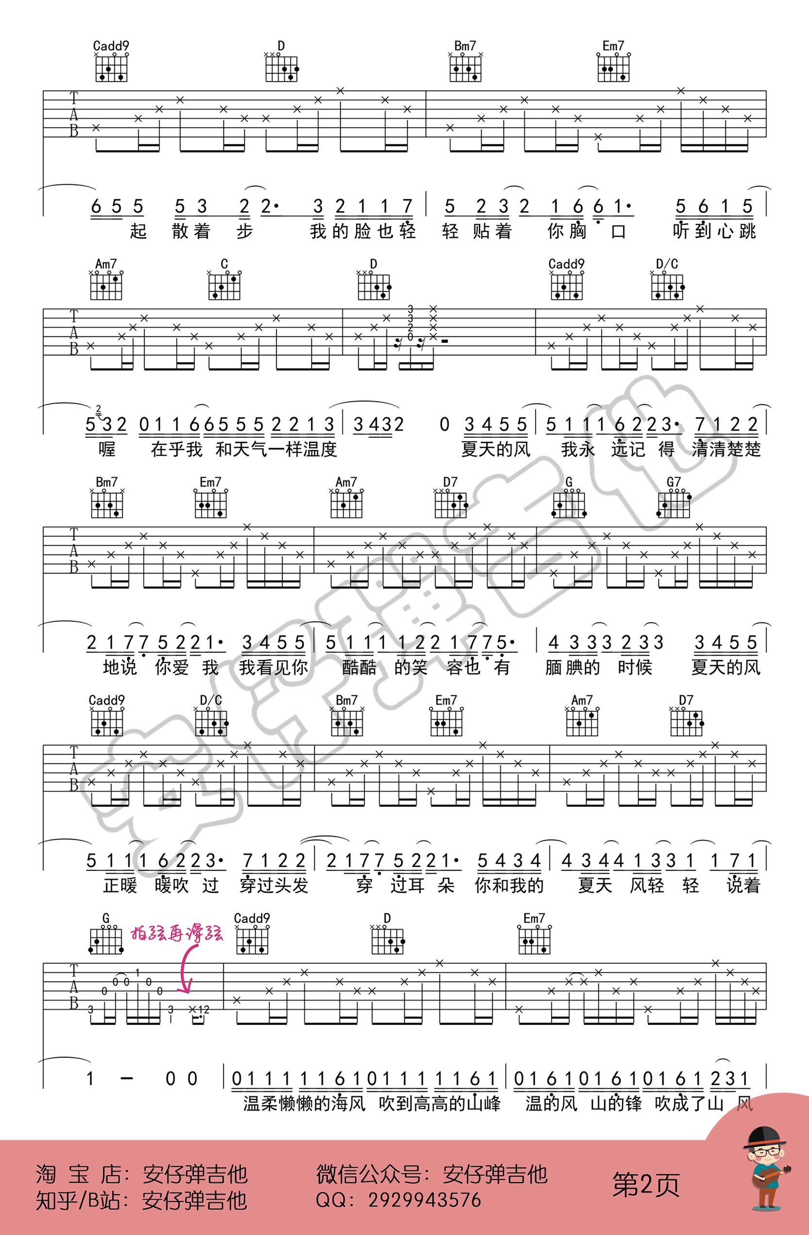 曲谱简介《夏天的风》吉他谱,温岚演唱的一首经典代表歌曲,夏天的风六线谱,女生可用变调夹夹五品唱C调,完整版共四张高清图片谱,安仔弹吉他编配出品,网更新分享。演奏提示,曲中拍弦在滑弦部分,只选择1、2处做此技巧,不需要太多。随谱附上《夏天的风》吉他弹唱和教学,喜欢的琴友们参照示范讲解练习。吉他简谱