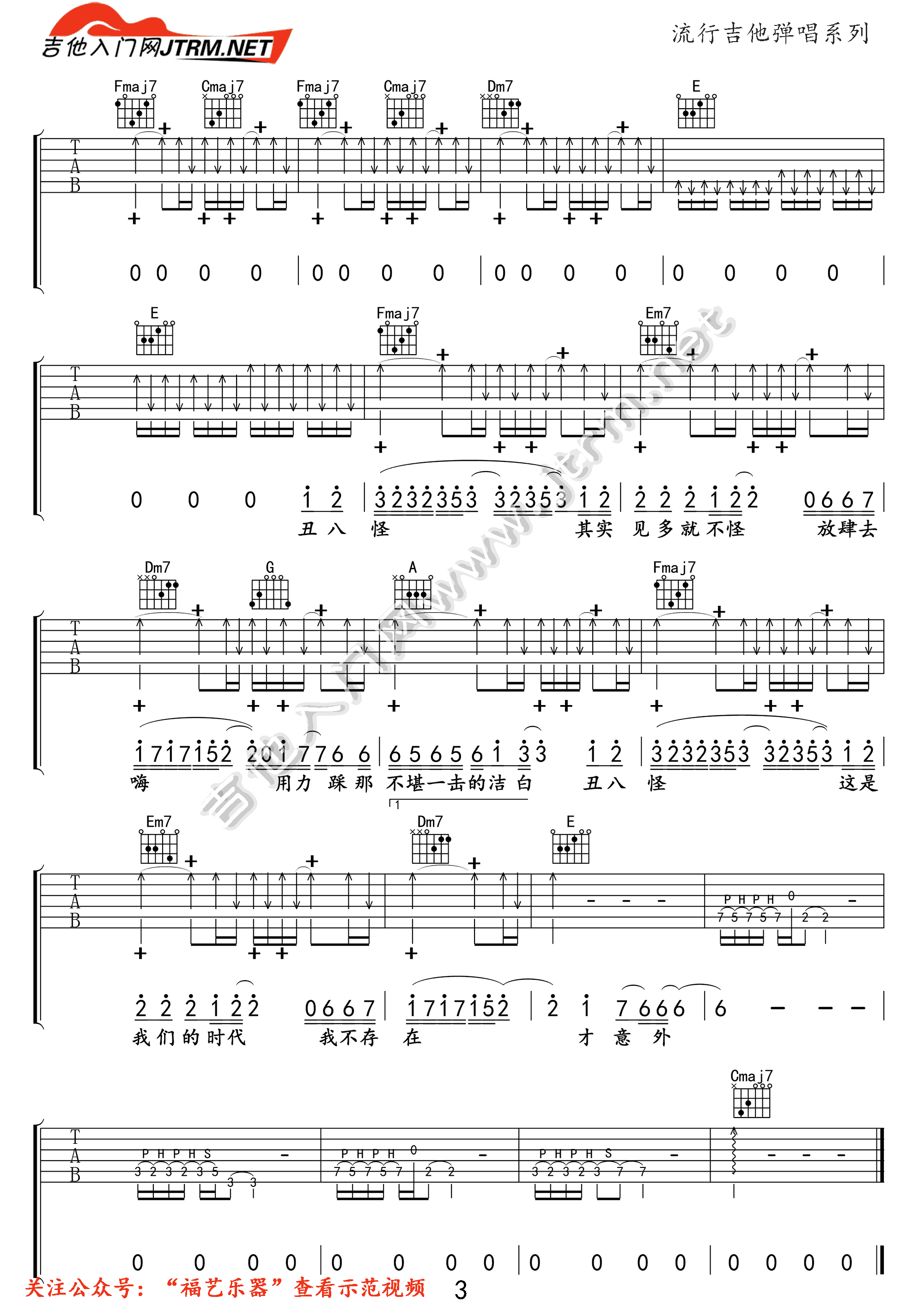 薛之谦《丑八怪》吉他它是甘世佳李荣演唱的歌曲这首歌的歌词很有意义,让人思考.由王福熠制谱是一首经典歌曲编配的C调吉他谱,演唱时可夹第一品,原调#CC本谱采用薛之谦非常好听的弹唱曲谱,下面完整版高清曲谱由吉他谱大全为大家更新分享,有喜欢吉它的朋友欢迎关注! 丑八怪这首歌,薛之谦演唱的一首歌曲,原调#CC,变调夹夹第一品,使用C调指法。丑八怪六线谱,为高清图片弹唱谱,喜欢这首歌曲的琴友们可以右键另存为打印收藏。随谱附上王福熠老师为大家带来的《丑八怪》吉他教学视频。