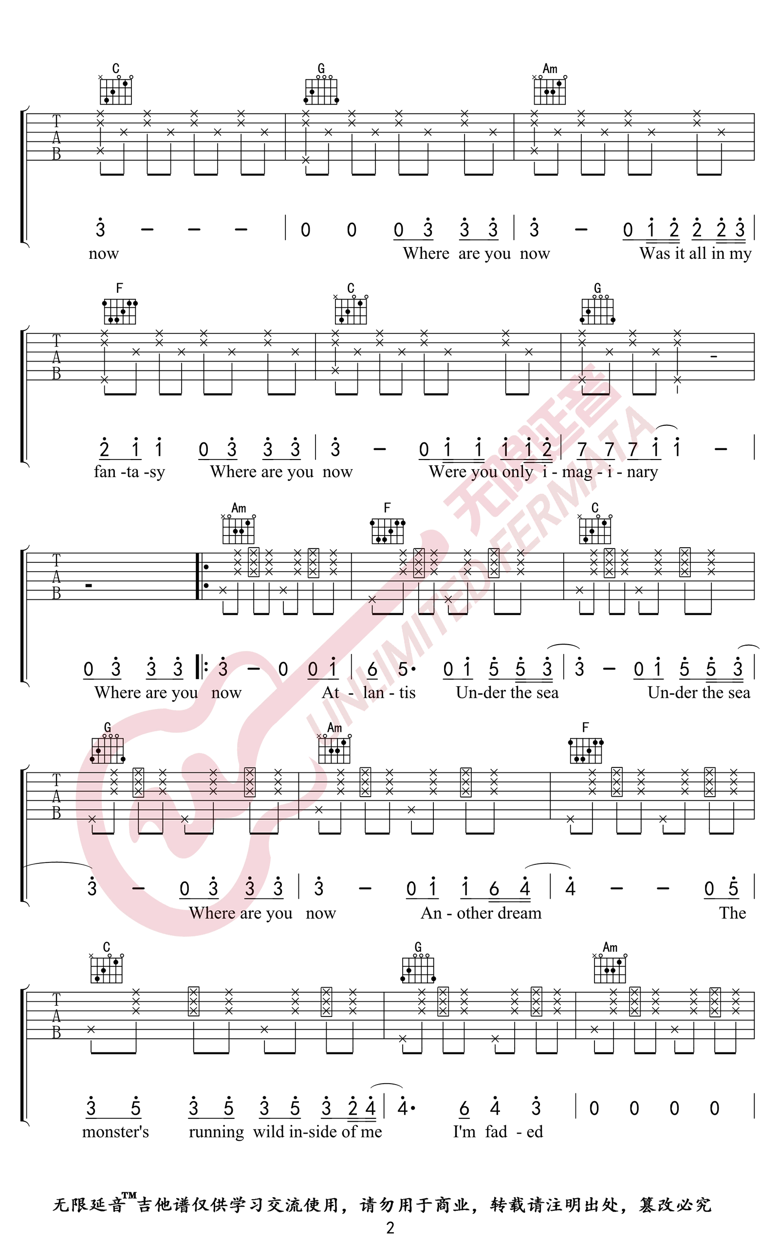 Faded吉他谱,原版Alan Walker歌曲,简单C调指弹曲谱,高清六线乐谱