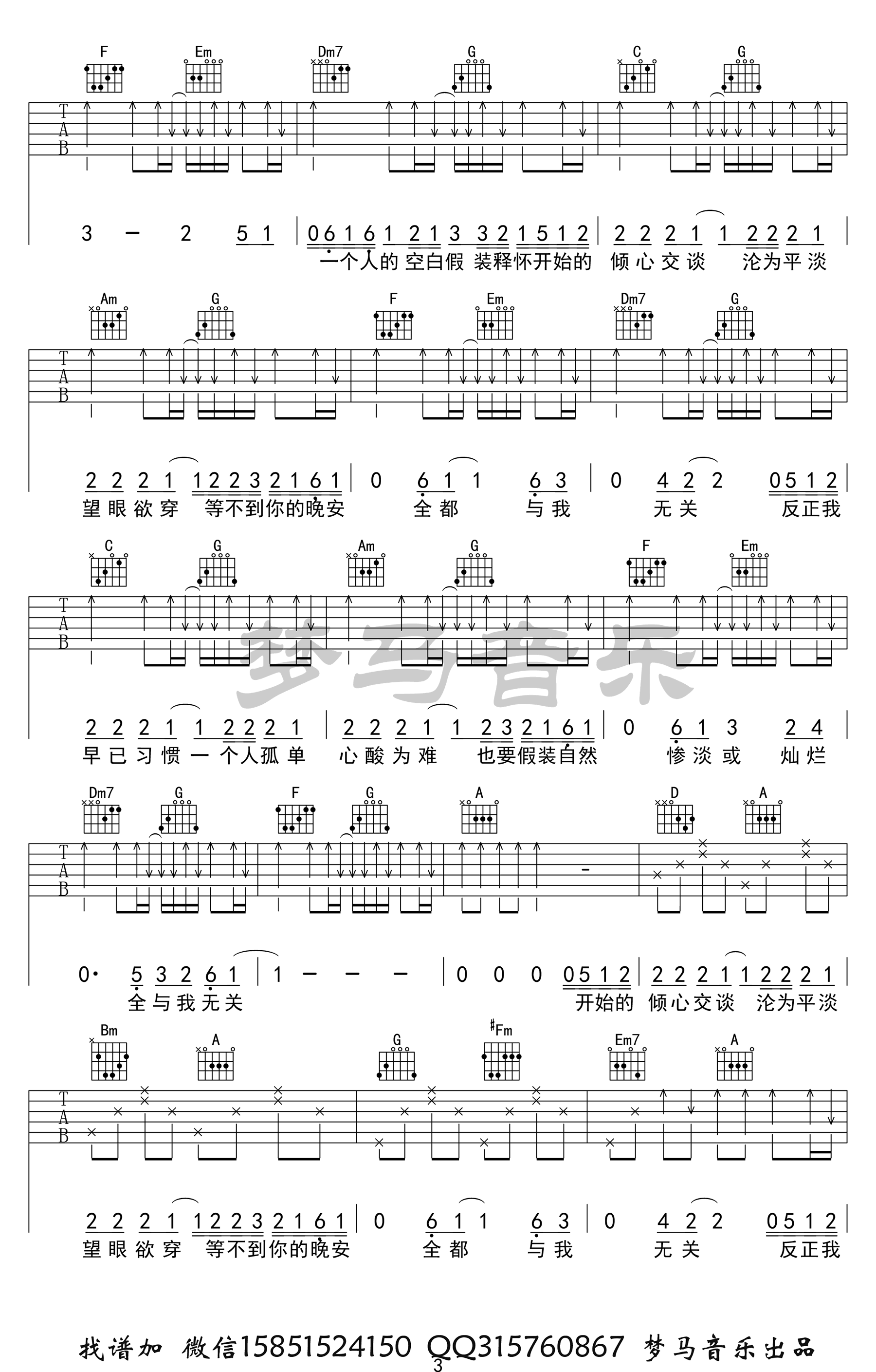 曲谱简介《与我无关》吉他谱,阿冗又一首火遍抖音的歌曲。与我无关吉他弹唱六线谱,C调版本,四张高清图片谱例,梦马音乐编配出品,网整理上传。夏祯阳老师:这首歌我看到网上有很多G调的谱子,我就做了一个C调的谱子,更适合喜欢唱高音的琴友或者女生来弹唱。总体来说很简单,希望大家喜欢!吉他简谱