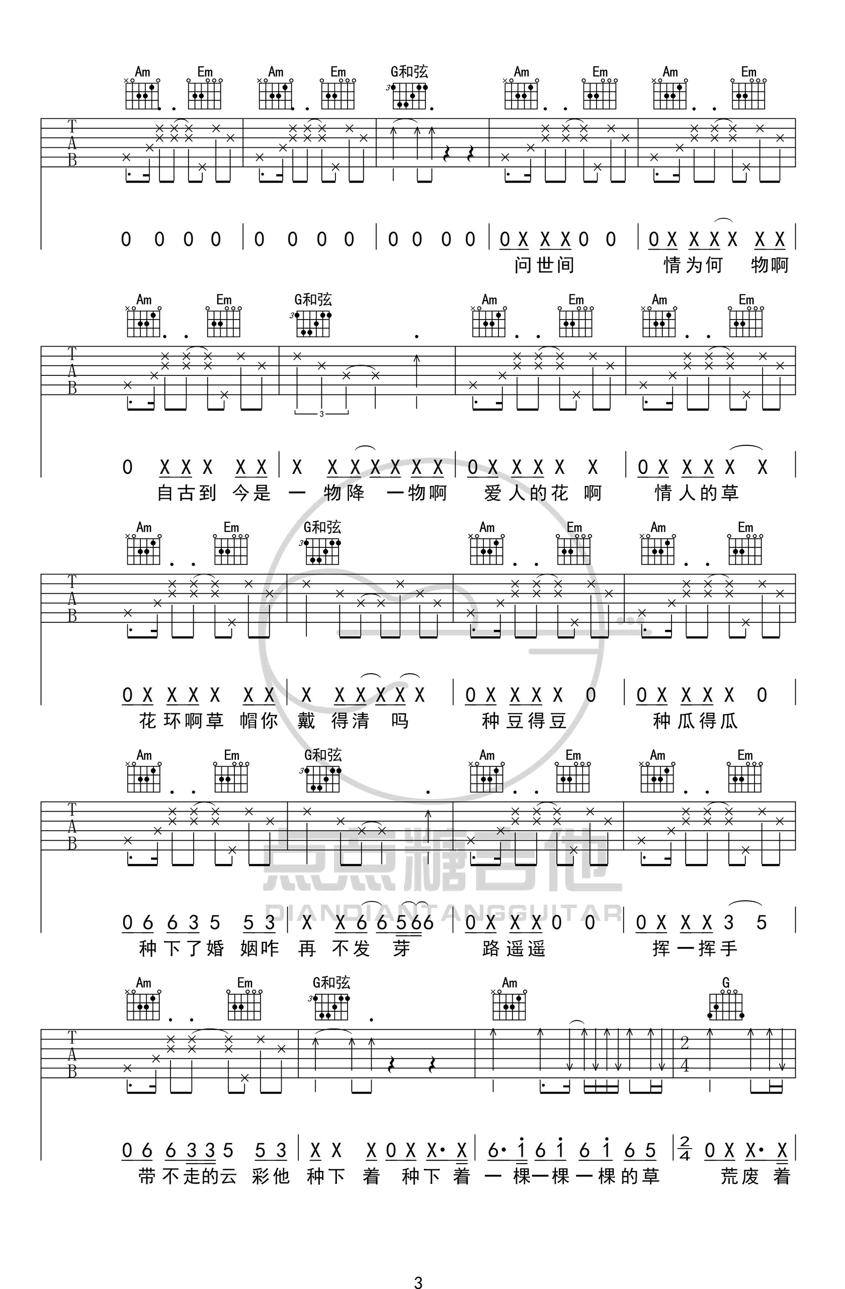 情儿吉他谱,简单点点原版指弹曲谱,二手玫瑰高清六线乐谱