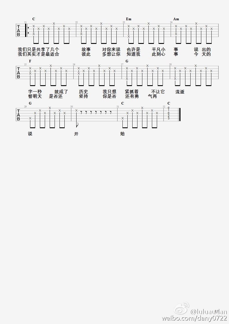 还想听你的故事吉他谱它是谢知非演唱的歌曲音符跨度不大,吉他手容易上手。由单眼宝宝制谱是一首经典歌曲编配的吉他谱,演唱时可4或5都变调夹夹夹4或5,本谱采用CAP非常好听的弹唱曲谱,下面完整版高清曲谱由吉他谱大全为大家更新分享,有喜欢吉它的朋友欢迎关注! 谢春花 还想听你的故事这首歌,CAPO夹4或5都行。还想听你的故事这首歌,是由luluaudan编配分享。谢春花和王碧浪一首非常好听的男女生对唱,还想听你的故事吉他弹唱谱,祝爱我的人和我爱的人安好幸福。推荐。
