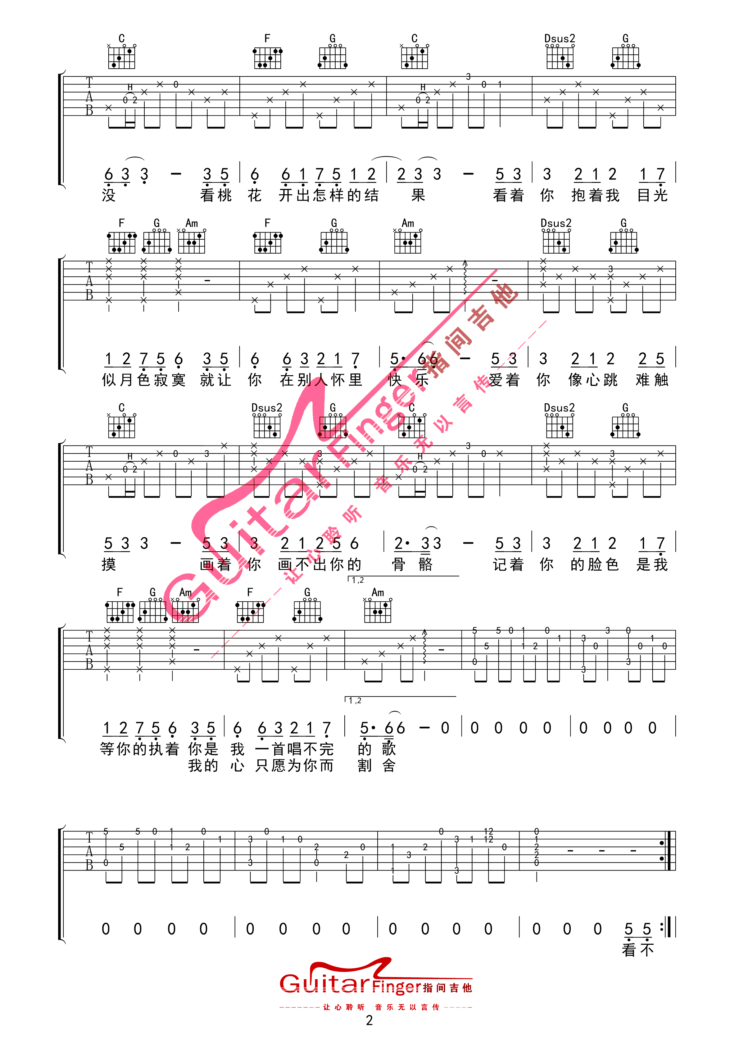 《画心》吉他谱,由张靓颖演唱的,流行弹唱吉他谱C调指间吉他高清版,画心六线谱,C调制法,一共2张高清弹唱图片谱,采用'4/4拍子,拍速为60-80,单吉他,弹奏难度为:简单,吉他部落 jita2012.com整理上传。画心 吉他简谱画心 歌词 作曲 : 藤原育郎 作词 : 陈少琪看不穿 是你失落的魂魄猜不透 是你瞳孔的颜色一阵风 一场梦 爱如生命般莫测你的心到底被什么蛊惑你的轮廓在黑夜