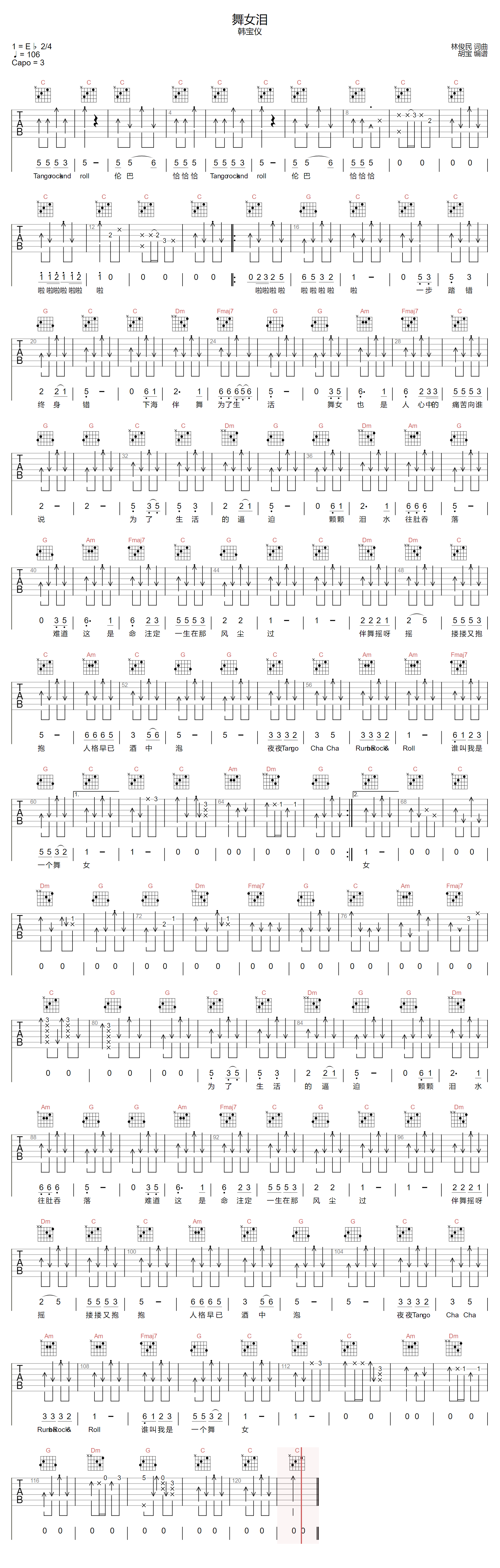 舞女泪吉他谱,简单C调原版指弹曲谱,脏手指高清六线乐谱