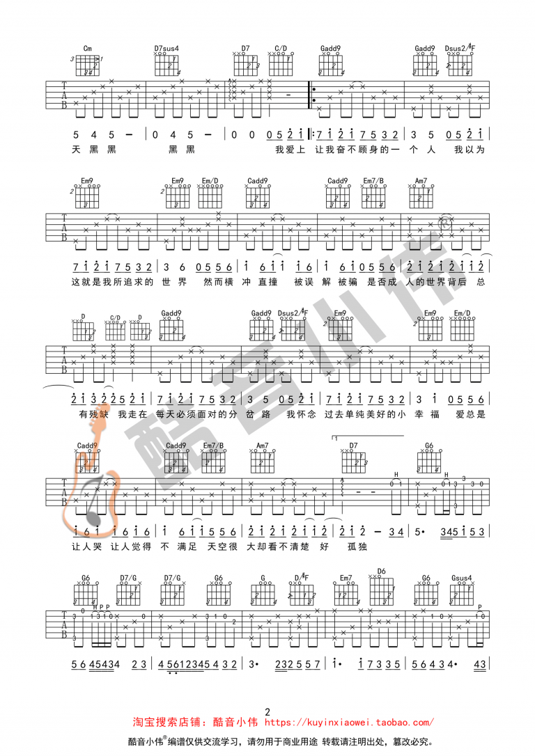 天黑黑吉他谱,G调弹奏,由廖莹如、吴依铮、李偲菘等制作人为孙燕姿量身定做,灵感来自于台湾民谣,歌曲采用了钢琴的纯简伴奏,词曲中间穿插着传统民谣“天黑黑”,表示了孙燕姿对小时候的自己的回顾,对现在的处世感悟。