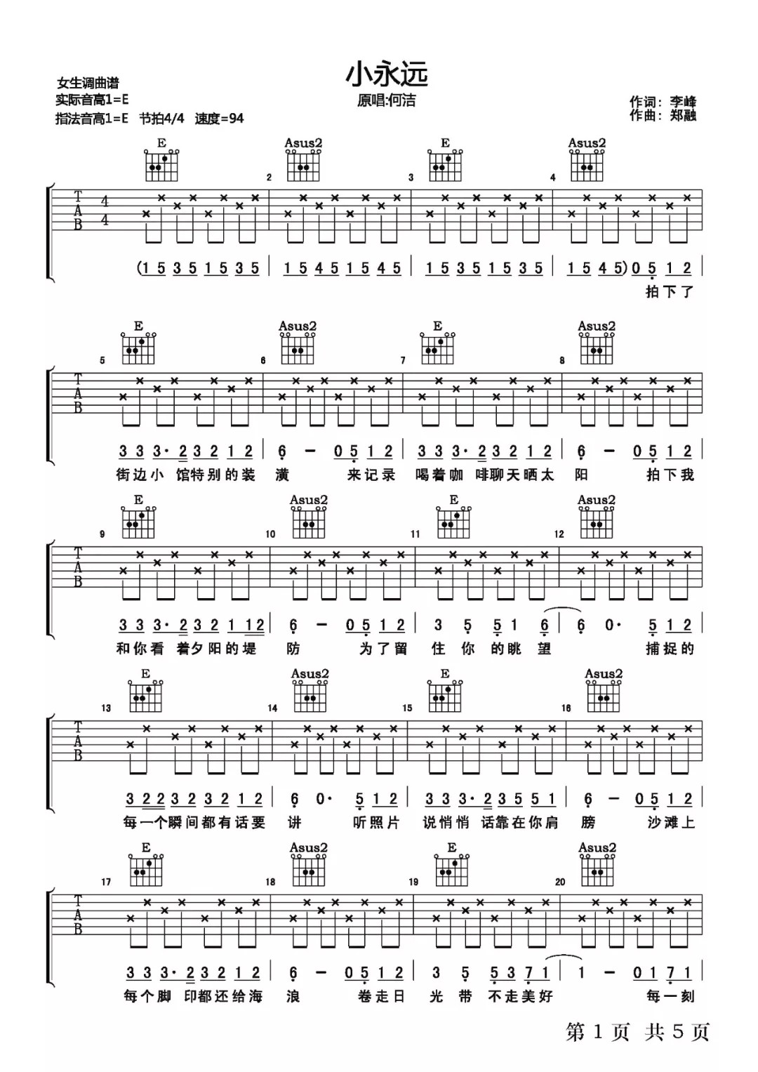 以上就是4/4节拍 E调版的小永远弹唱简谱,如果正是您所寻找的六线高清图片谱,希望能收藏本站,这里会完全免费且源源不断更新各种何洁简单入门曲谱