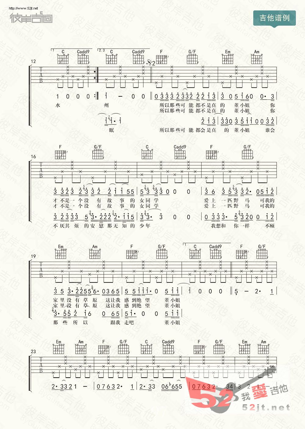 《董小姐》吉他谱,由宋冬野演唱的,民谣C调指法+间奏+尾奏完整版吉他谱视频,董小姐六线谱,C调制法,一共3张高清弹唱图片谱,采用'4/4拍子,拍速为60-80,单吉他,弹奏难度为:极简,吉他部落 jita2012.com整理上传。董小姐 吉他简谱董小姐 歌词董小姐你从没忘记你的微笑就算你和我一样 渴望着衰老董小姐你嘴角向下的时候很美就像安和桥下 清澈的水董小姐我也是个复杂的