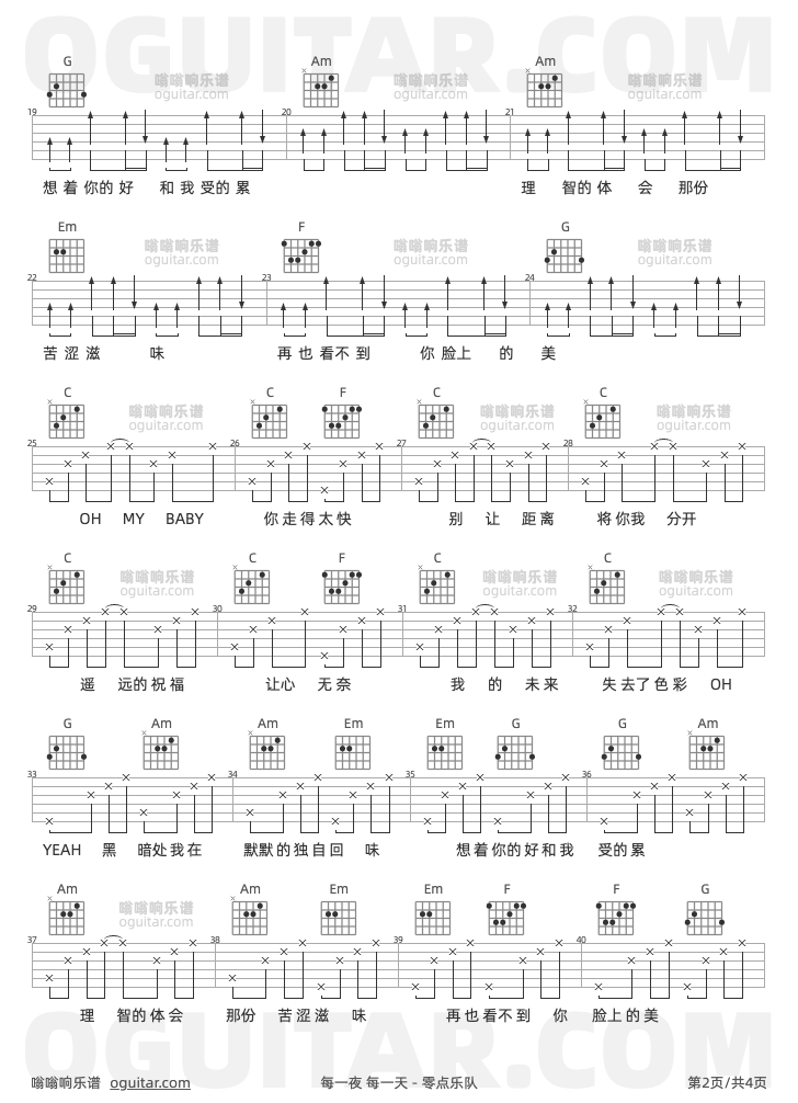 每一夜 每一天吉他谱,零点乐队歌曲,C调高清图,4张六线原版简谱