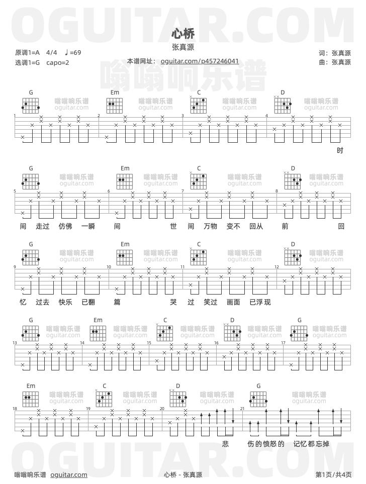 心桥吉他谱,张真源歌曲,G调高清图,4张六线原版简谱