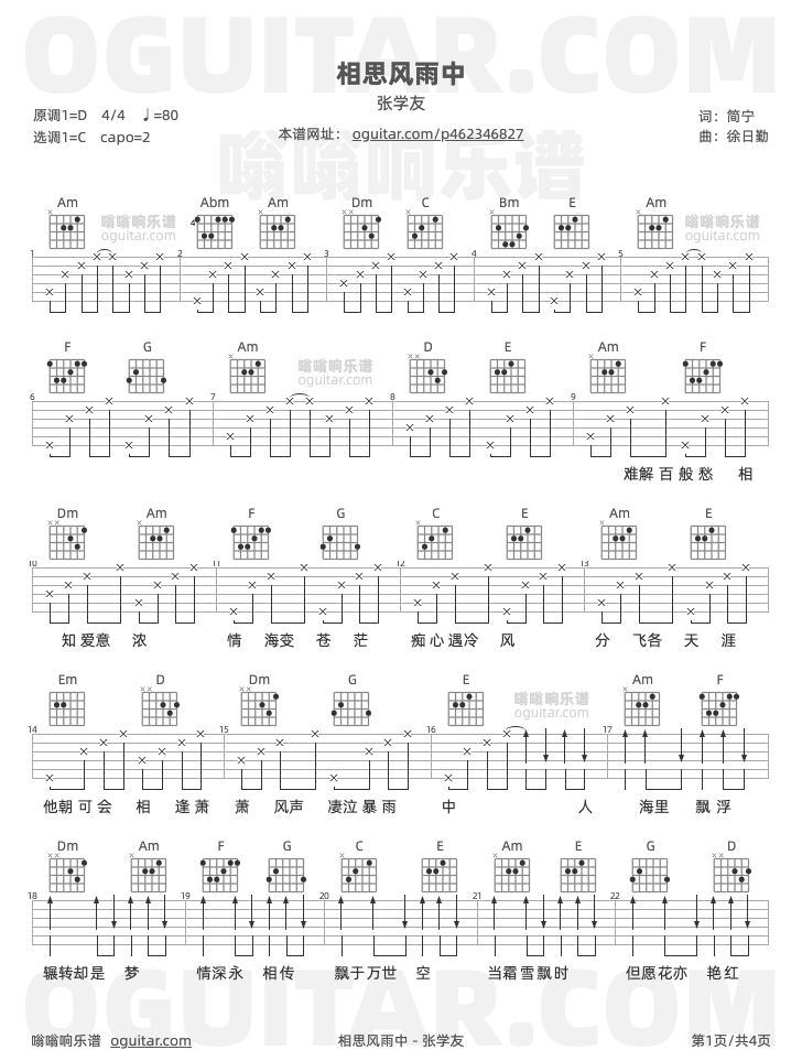 相思风雨中吉他谱,张学友歌曲,C调高清图,4张六线原版简谱
