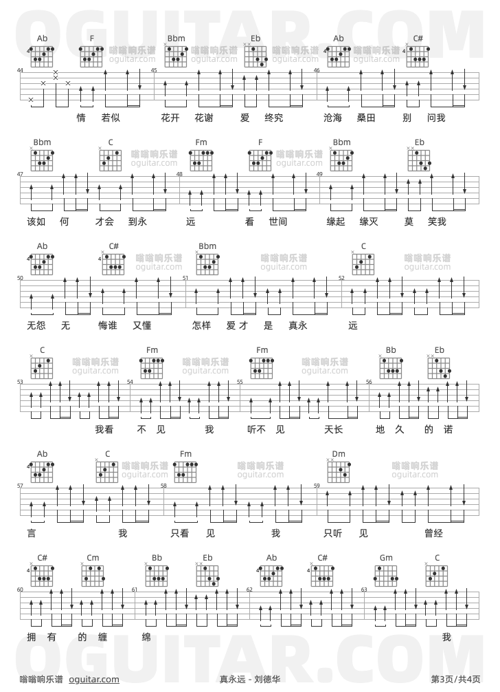 真永远吉他谱简单版,它是刘德华演唱的歌曲,由嗡嗡响制谱,是一首经典歌曲编配的G调吉他谱,演唱时可夹第1品(Capo=1),演奏时间为4分0秒,原调为Ab本谱采用G调,是非常好听的弹唱曲谱,下面4张高清曲谱由吉他部落jita2012.com为大家更新分享,有喜欢吉它的朋友欢迎收藏!