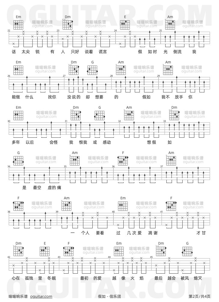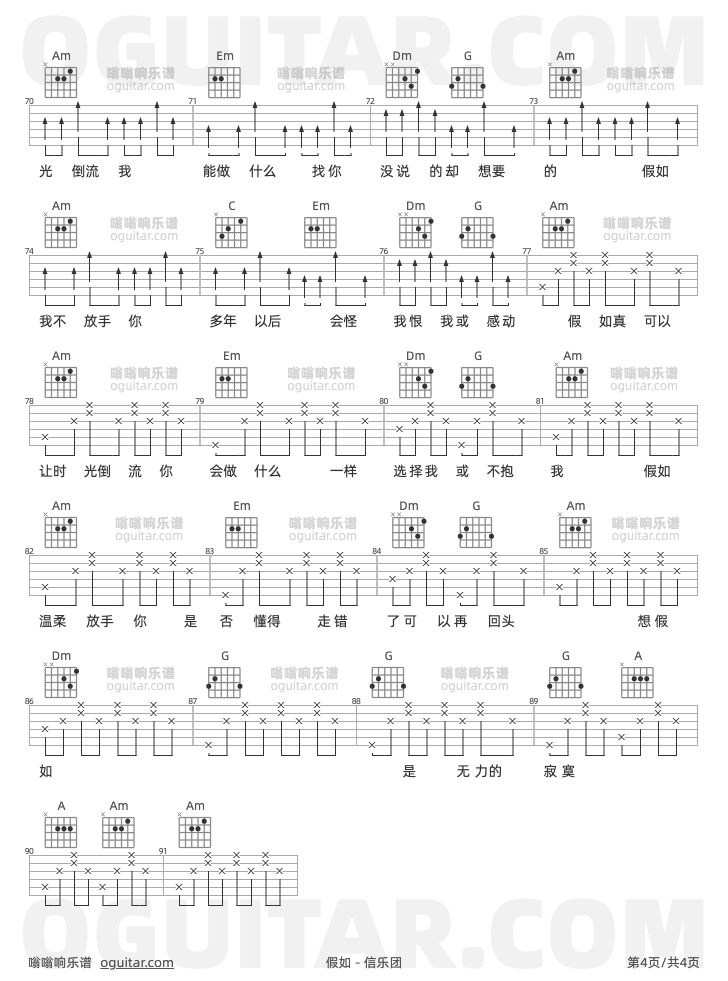 假如吉他谱,信乐团歌曲,C调高清图,4张六线原版简谱