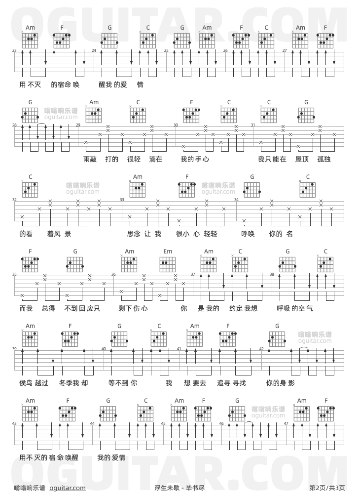 浮生未歇吉他谱,毕书尽歌曲,C调高清图,3张六线原版简谱