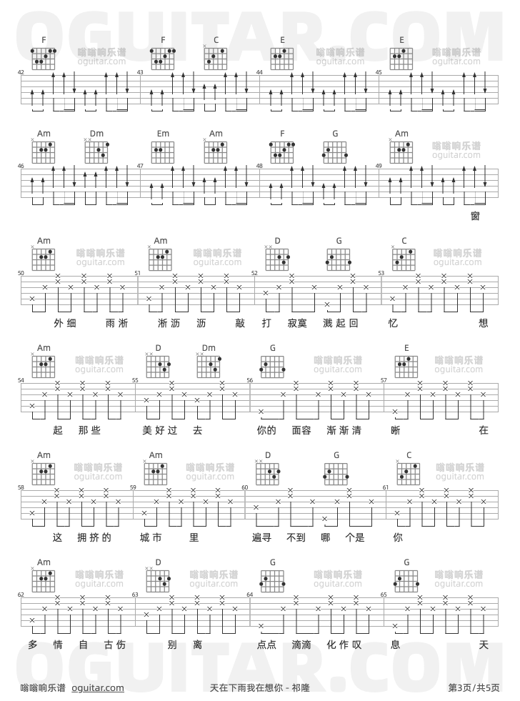 天在下雨我在想你吉他谱,祁隆歌曲,C调高清图,5张六线原版简谱