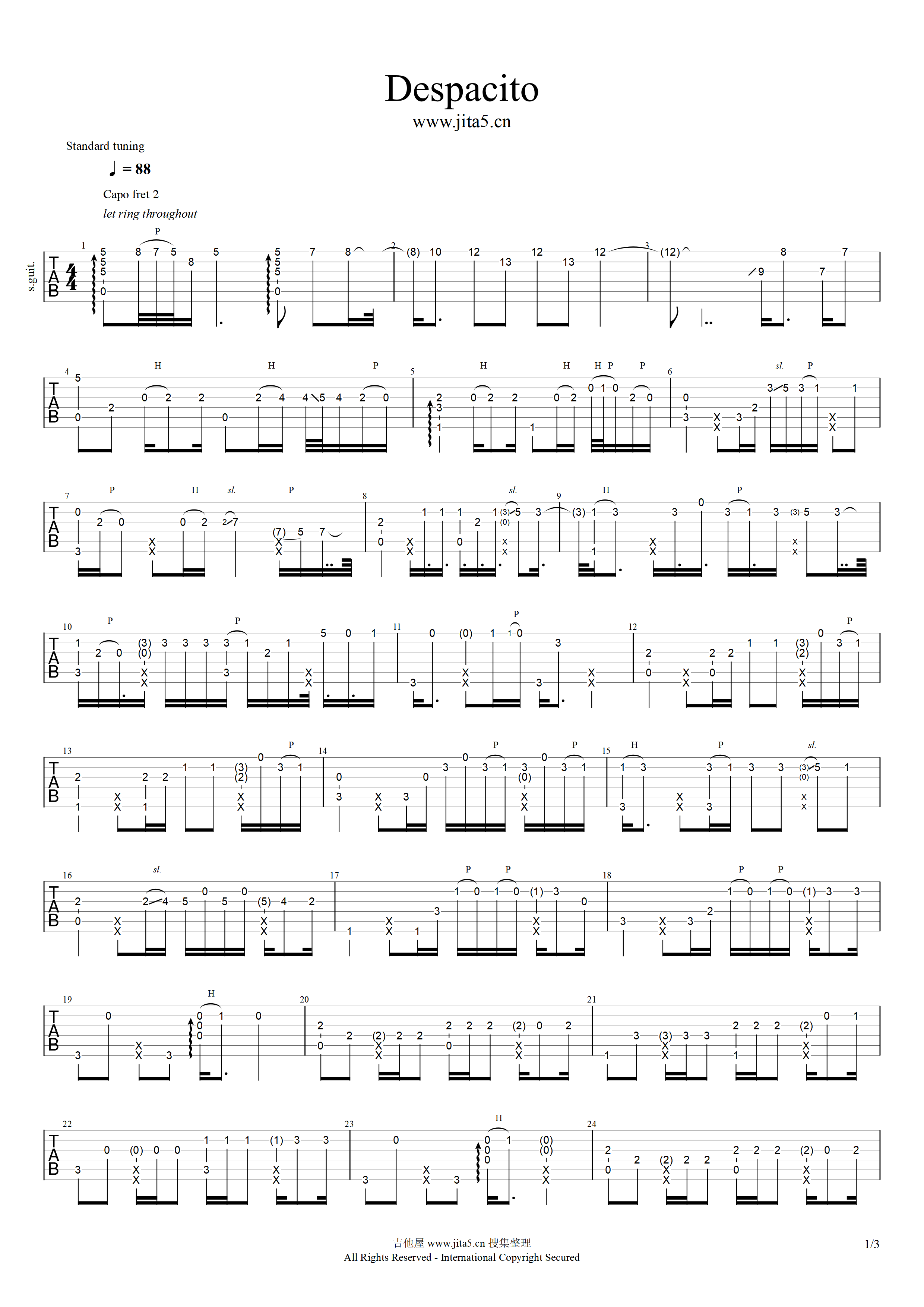 《Despacito指弹吉他谱_《Despacito》独奏高清六线谱免费分享,《Despacito》是由路易斯·冯西、洋基老爹合唱的一首歌曲,由艾瑞卡·安德、路易斯·冯西、洋基老爹共同创作,后贾斯汀比伯的英文混音版本也是火到不行。这里是根据原曲改编的指弹吉他版本,指法难度适中,演奏时夹变调夹2品,需要花一定时间来练习。