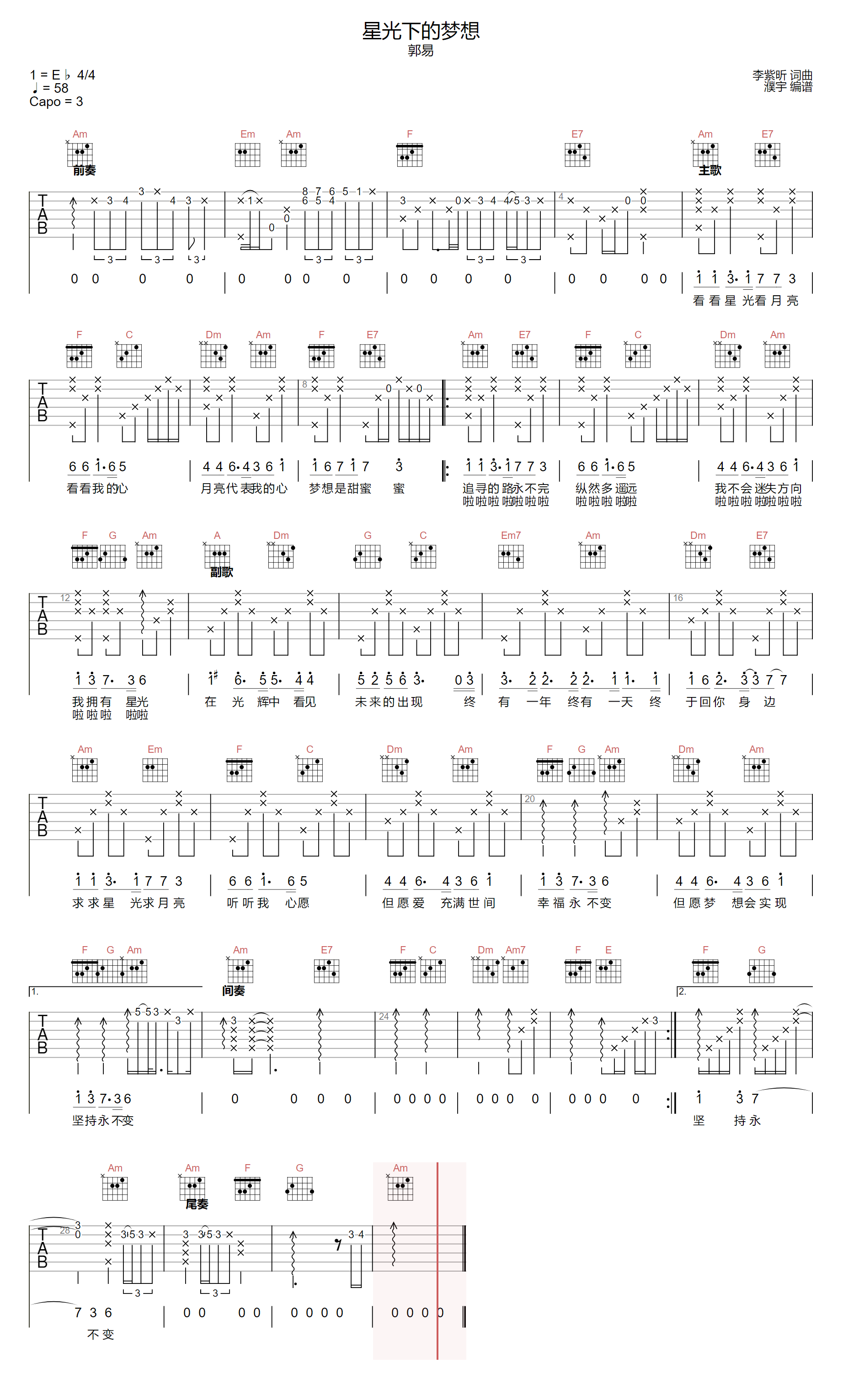 星光下的梦想吉他谱,简单C调原版指弹曲谱,郭易高清六线乐谱