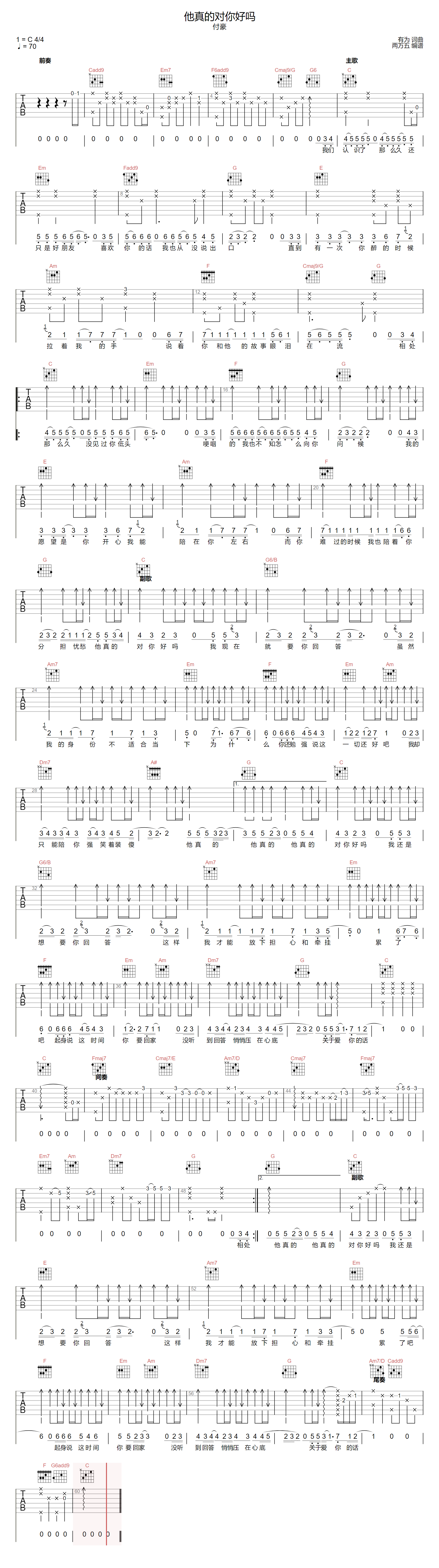 他真的对你好吗吉他谱是付豪演唱的一首好听的歌曲,采用C调原版吉他弹奏。演唱时不夹变调夹即可保持原调,也可根据个人嗓音情况选择,,也可自由发挥。。。