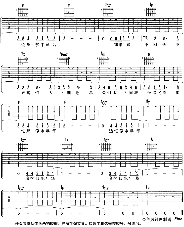 《年华》吉他谱,由刘若英演唱的,流行弹唱图片,年华六线谱,C调制法,一共4张高清弹唱图片谱,采用'4/4拍子,拍速为60-80,单吉他,弹奏难度为:中级,吉他部落 jita2012.com整理上传。年华 吉他简谱年华 歌词 作曲 : 阿信 作词 : 阿信那秋千孤独的摇啊曾经是谁的快乐在上面摆荡草原上摇曳着的花啊阳光蒸发了无人的喧哗那孩子离开而且长大发现旅途上并不盛开繁花一路上追