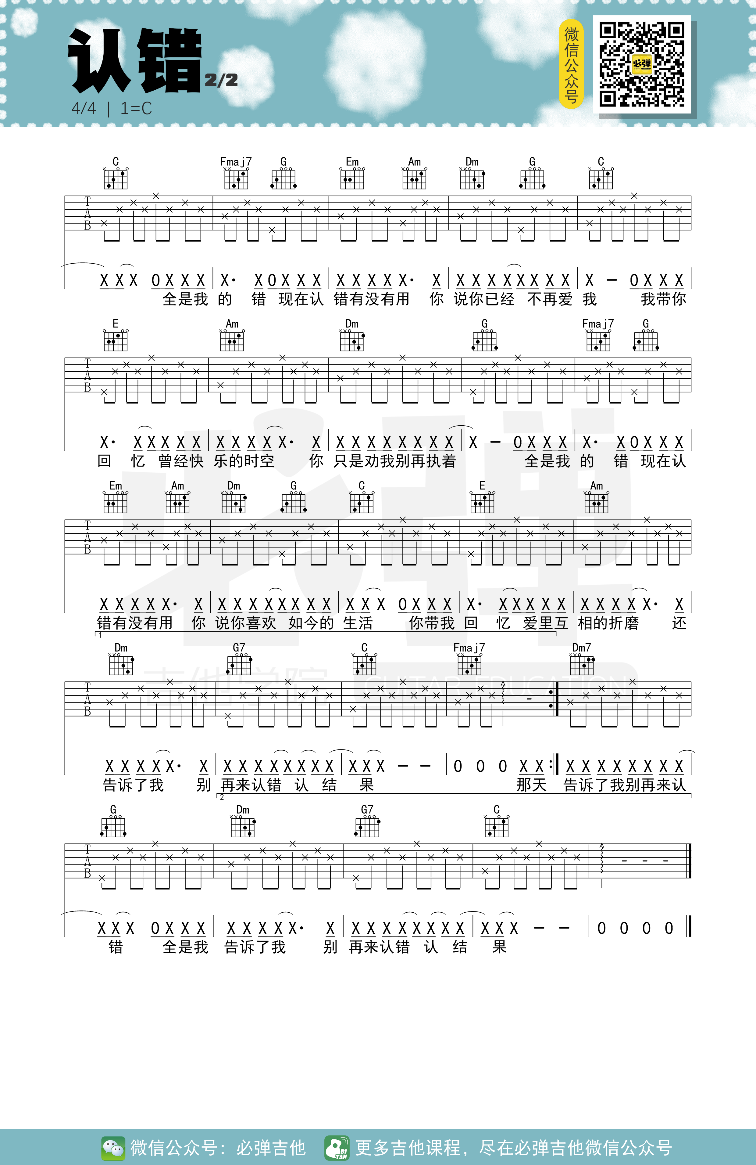 以上就是4/4节拍C调版的认错弹唱简谱完整内容,希望这个简单六线高清图片教学谱能帮到您,也希望您能收藏本站,这里每天源源不断更新各种许嵩简单入门曲谱。