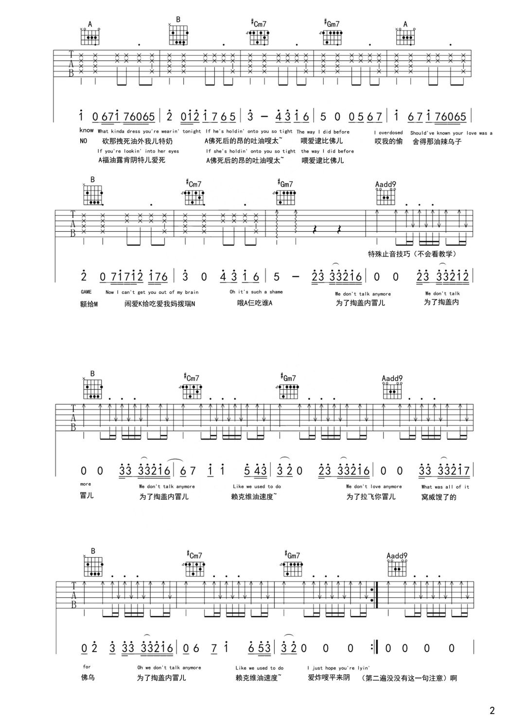 We-Don’t-Talk-Anymore吉他谱是Charlie-Puth演唱的一首好听的歌曲,采用E调原版吉他弹奏。演唱时不夹变调夹即可保持原调,也可根据个人嗓音情况选择,,也可自由发挥。。。