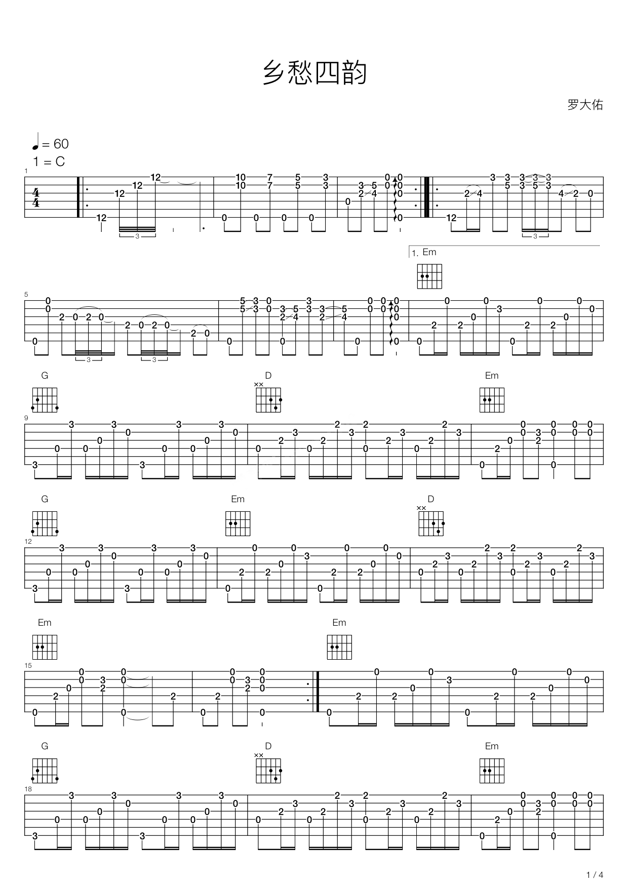 乡愁吉他谱,简单原版指弹曲谱,罗大佑高清六线乐谱