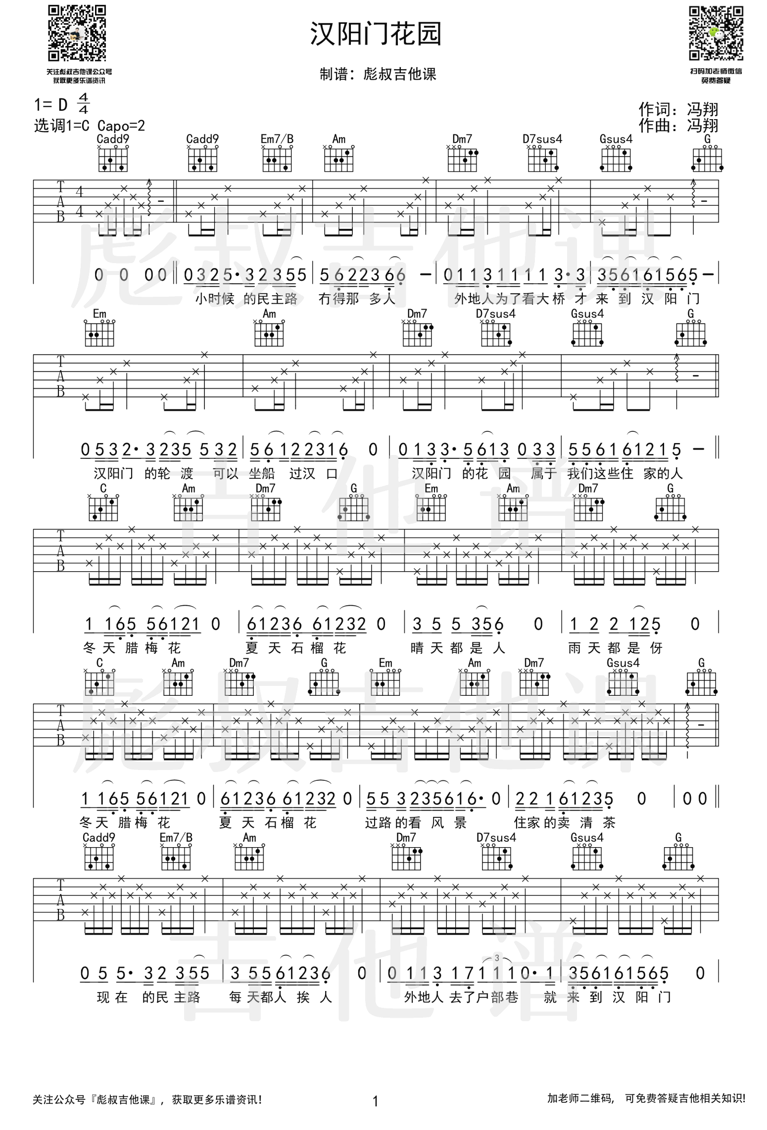 《《汉阳门花园》吉他谱_冯翔_C调弹唱高清六线谱免费分享,《汉阳门花园》是由武汉本土音乐人冯翔创作并演唱的一首武汉方言民谣歌曲。这个歌曲冲破悲壮的疫情报道,在身处五湖四海的武汉人间传唱,甚至传到海外。在这样一个时刻,乡愁击中了人们内心的柔软之处,歌曲中那些关于武汉巷弄的喧嚷日常,充满烟火气和几代人记忆的市井生活,在今天,成为所有武汉人渴求的梦,那些渴望能再去武汉的外地人,也在歌曲的武汉方言中感觉到在地人的江湖温柔。
