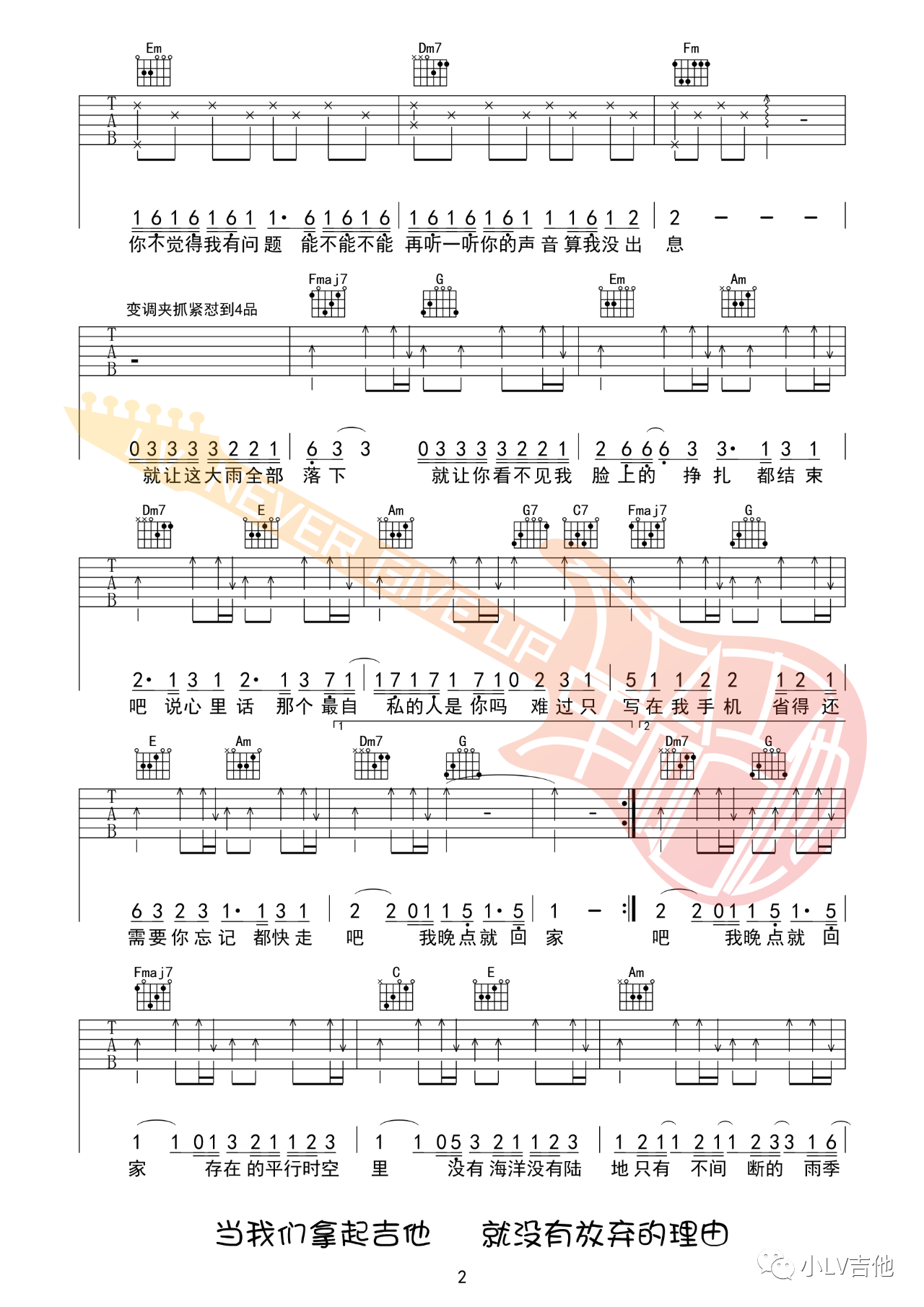 就让这大雨全都落下吉他谱,C调编配版吉他弹唱谱,来自小LV老师编配扒谱,附弹唱演示。变调夹夹第三品弹唱,从主歌的分解伴奏转到副歌的扫弦节奏时,迅速变调夹转四品,整体的难度★★★☆☆。