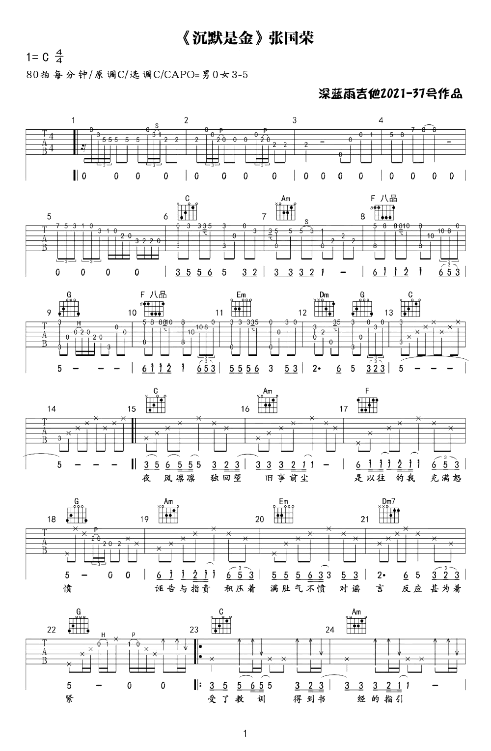 沉默是金这首歌,张国荣的一首经典粤语歌曲,充满人生哲理。《沉默是金》吉他弹唱谱,编配,变调夹男生不用女生3-5品,完整版共三张图片简谱。