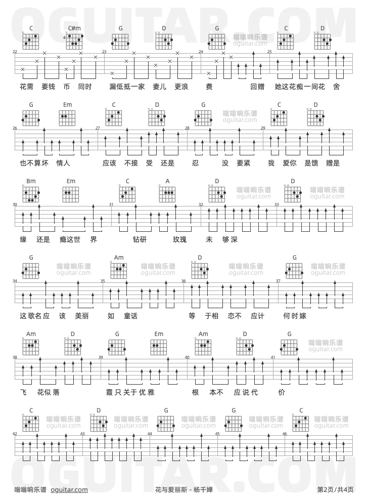 花与爱丽斯吉他谱,杨千嬅歌曲,G调高清图,4张六线原版简谱