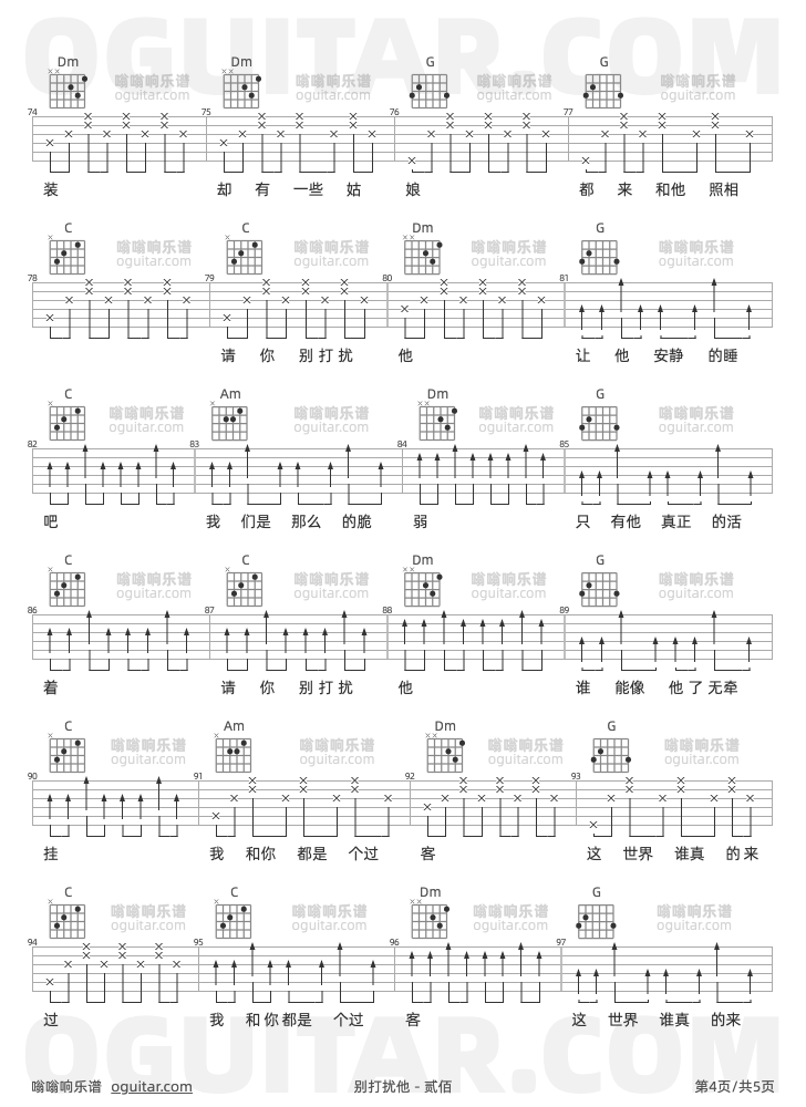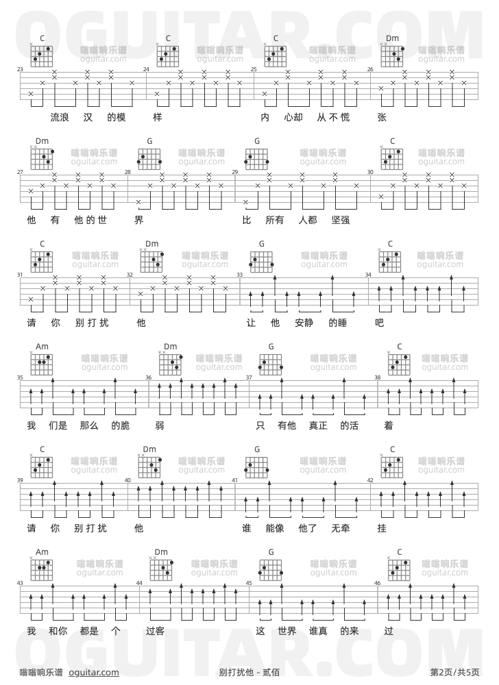 别打扰他吉他谱,贰佰歌曲,C调高清图,5张六线原版简谱