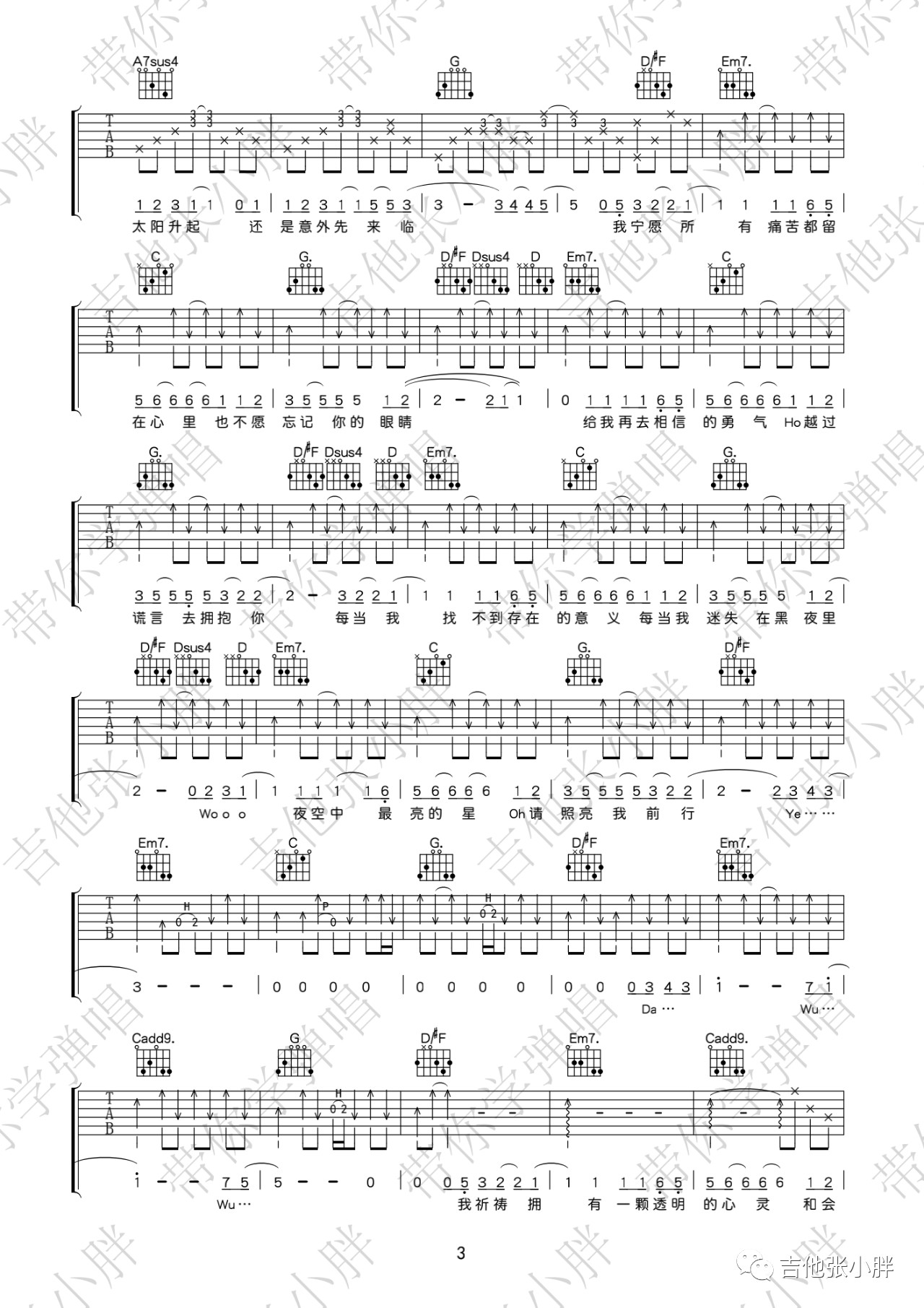 夜空中最亮的星吉他谱,G调指法吉他弹唱六线谱,来自张小胖老师编配分享,共四张图片谱例。歌曲的前奏是一串三连音,难度不大,中间有几个地方比较考验和弦功底,比如D/#F-Dsus4-D-Em7的快速转换,整体难度适中。