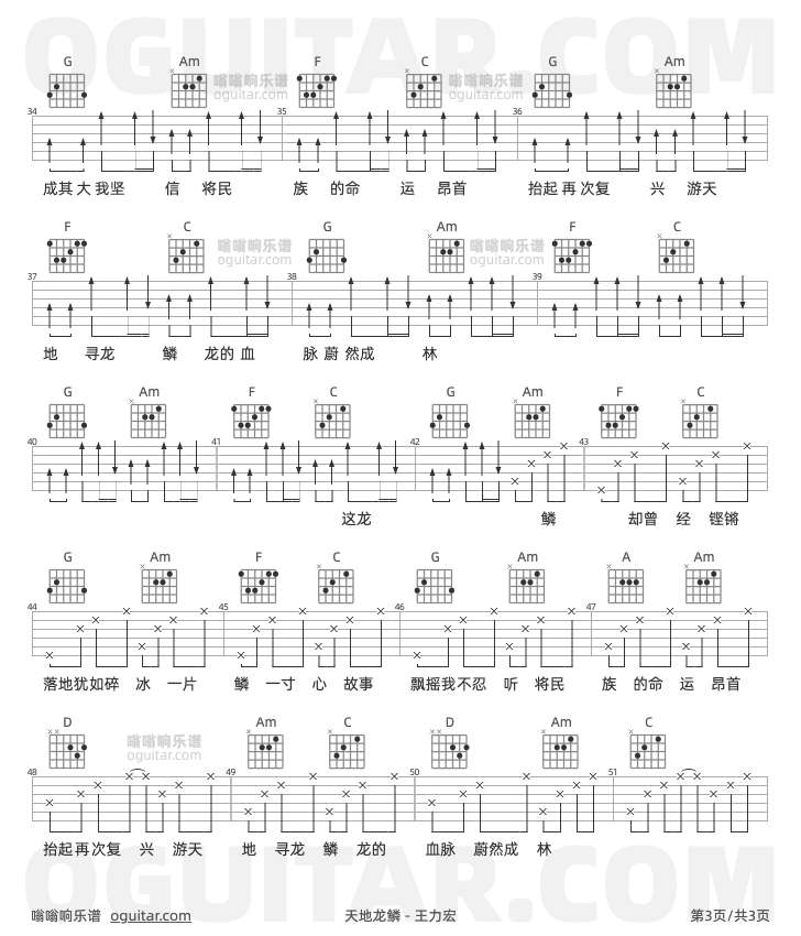 天地龙鳞吉他谱,王力宏歌曲,C调高清图,3张六线原版简谱