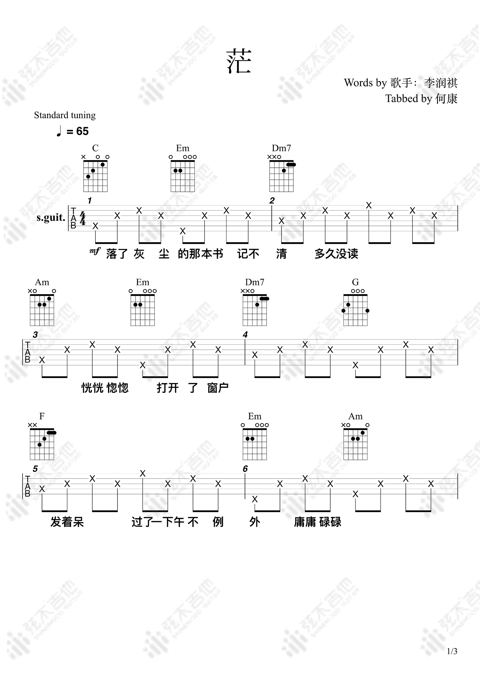 《茫吉他谱_李润祺_《茫》G调弹唱高清六线谱免费分享,《茫》是由李润祺演唱的一首歌,整首歌都很轻巧,第一段主歌配器只有钢琴和一个类似响指的打击乐声,中间间杂着一些简单的上扬的合成器音效,给人一种不牢固、不稳定的感觉,很有他自己的少年感。第二遍主歌在第一遍的基础上加了一点点很克制的鼓点,和声先是上下八度,接着变成一种往外冲的感觉(挣脱感很强)。